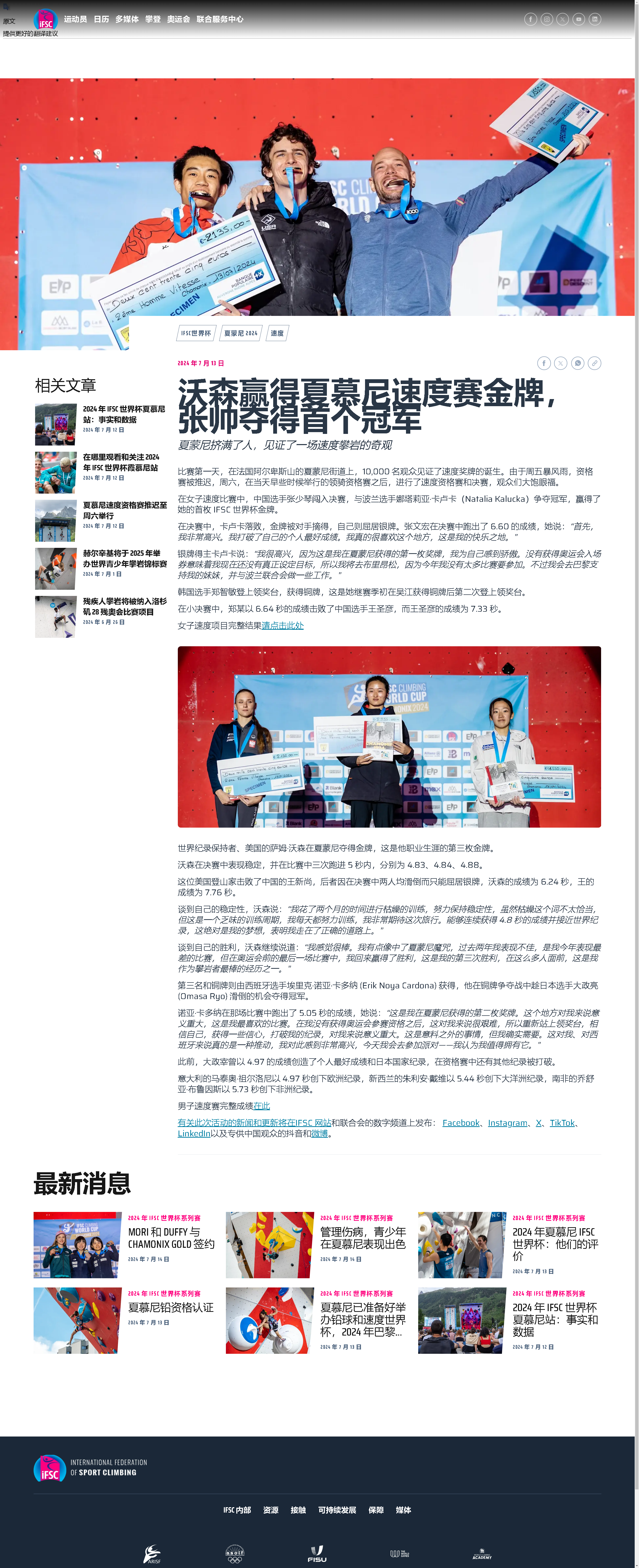 中國選手張少琴(中)在2024攀巖世界杯法國夏蒙尼站中獲得女子速度項(xiàng)目冠軍。圖源:國際攀聯(lián)官網(wǎng)