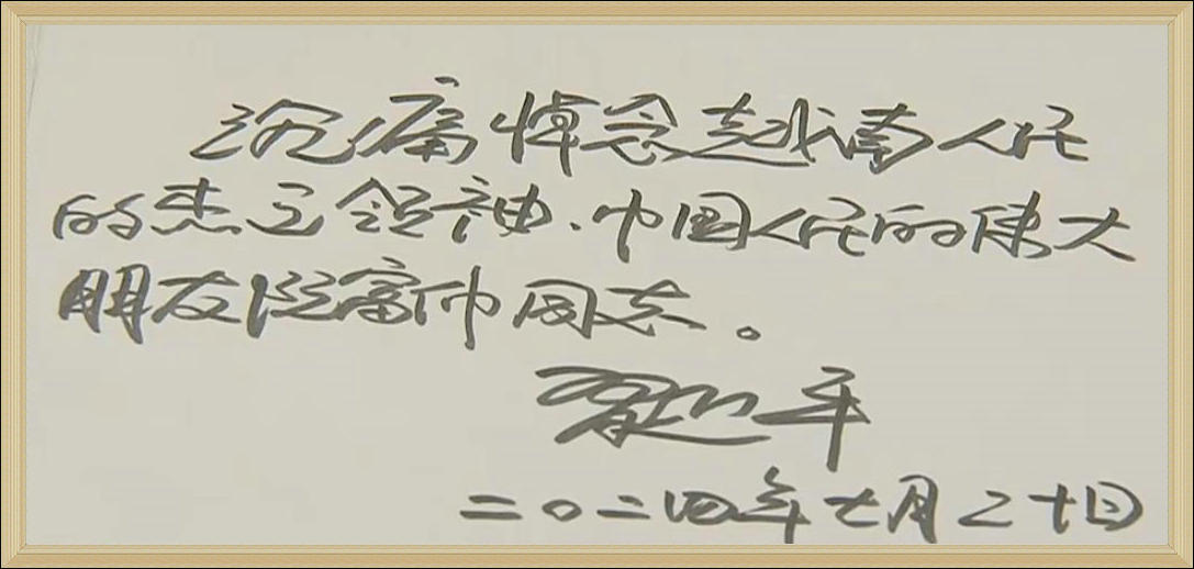習(xí)近平走到阮富仲遺像前駐足默哀,向遺像三鞠躬,在吊唁簿上留言并簽名。