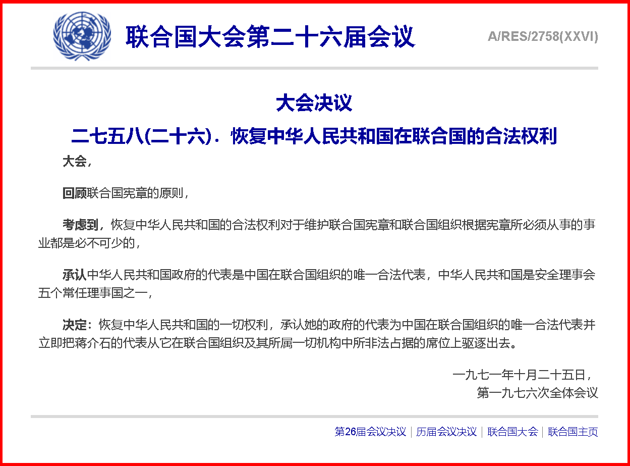 王毅說(shuō),臺(tái)灣是中國(guó)領(lǐng)土不可分割的一部分,這既是歷史,也是現(xiàn)實(shí)?!堕_羅宣言》《波茨坦公告》明確規(guī)定把日本竊取的中國(guó)領(lǐng)土,包括臺(tái)灣、澎湖列島歸還中國(guó),構(gòu)成了二戰(zhàn)后國(guó)際秩序的重要組成部分。53年前,就是在這座神圣莊嚴(yán)的大廳,第26屆聯(lián)合國(guó)大會(huì)以壓倒性多數(shù)通過(guò)第2758號(hào)決議,決定恢復(fù)中華人民共和國(guó)在聯(lián)合國(guó)的一切權(quán)利,承認(rèn)中華人民共和國(guó)政府代表是中國(guó)在聯(lián)合國(guó)唯一合法代表,并立即把臺(tái)灣地區(qū)的代表從聯(lián)合國(guó)及其所屬一切機(jī)構(gòu)中驅(qū)逐出去。這一決議徹底解決了包括臺(tái)灣在內(nèi)全中國(guó)在聯(lián)合國(guó)的代表權(quán)問(wèn)題,明確不存在“兩個(gè)中國(guó)”,不存在“一中一臺(tái)”。在這一原則問(wèn)題上,沒有灰色地帶,沒有模糊空間。中國(guó)必將實(shí)現(xiàn)完全統(tǒng)一,臺(tái)灣必將回歸祖國(guó)懷抱,這是任何人、任何勢(shì)力都阻擋不了的歷史大勢(shì)!