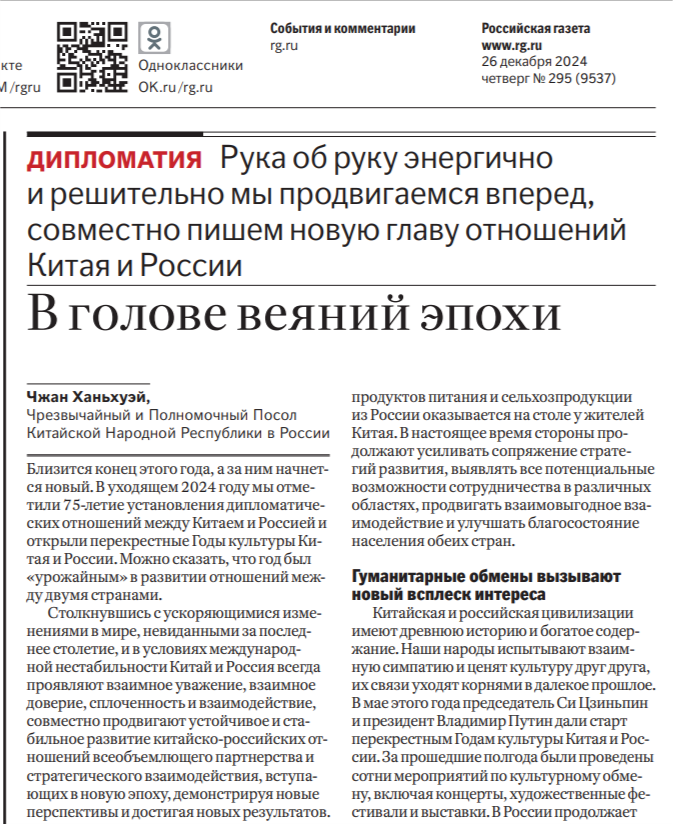 12月26日,張漢暉大使在俄政府機(jī)關(guān)報(bào)《俄羅斯報(bào)》發(fā)表署名文章《攜手前行 踔厲奮進(jìn) 共同譜寫中俄關(guān)系新華章》,全文如下: