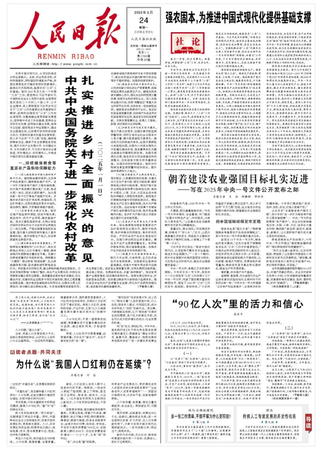 中共中央、國務(wù)院公開發(fā)布《關(guān)于進(jìn)一步深化農(nóng)村改革 扎實(shí)推進(jìn)鄉(xiāng)村全面振興的意見》。這是黨的十八大以來中央連續(xù)發(fā)出的第十三個(gè)指導(dǎo)“三農(nóng)”工作的“一號(hào)文件”,體現(xiàn)了以習(xí)近平同志為核心的黨中央對(duì)“三農(nóng)”工作的重視一以貫之,強(qiáng)農(nóng)惠農(nóng)富農(nóng)的政策持續(xù)加力。抓好“三農(nóng)”工作,對(duì)于中國式現(xiàn)代化建設(shè)具有重要意義。當(dāng)前,各地區(qū)各部門要抓好中央一號(hào)文件貫徹落實(shí),采取有效措施強(qiáng)農(nóng)固本。