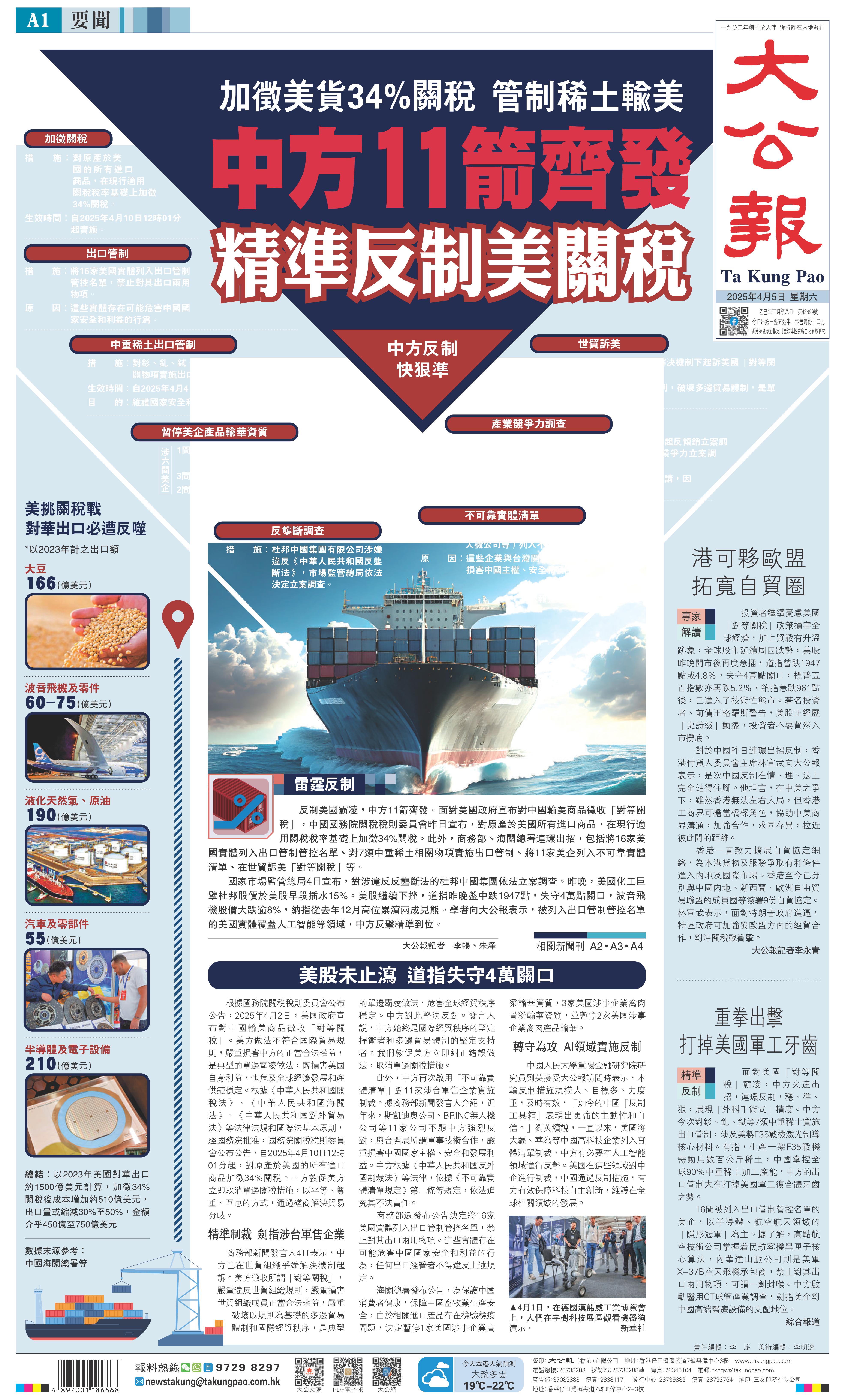 反制美國霸凌,中方11箭齊發(fā)。面對美國政府宣布對中國輸美商品征收「對等關(guān)稅」,中國國務(wù)院關(guān)稅稅則委員會昨日宣布,對原產(chǎn)于美國所有進(jìn)口商品,在現(xiàn)行適用關(guān)稅稅率基礎(chǔ)上加征34%關(guān)稅。此外,商務(wù)部、海關(guān)總署連環(huán)出招,包括將16家美國實(shí)體列入出口管制管控名單、對7類中重稀土相關(guān)物項(xiàng)實(shí)施出口管制、將11家美企列入不可靠實(shí)體清單、在世貿(mào)訴美「對等關(guān)稅」等。
