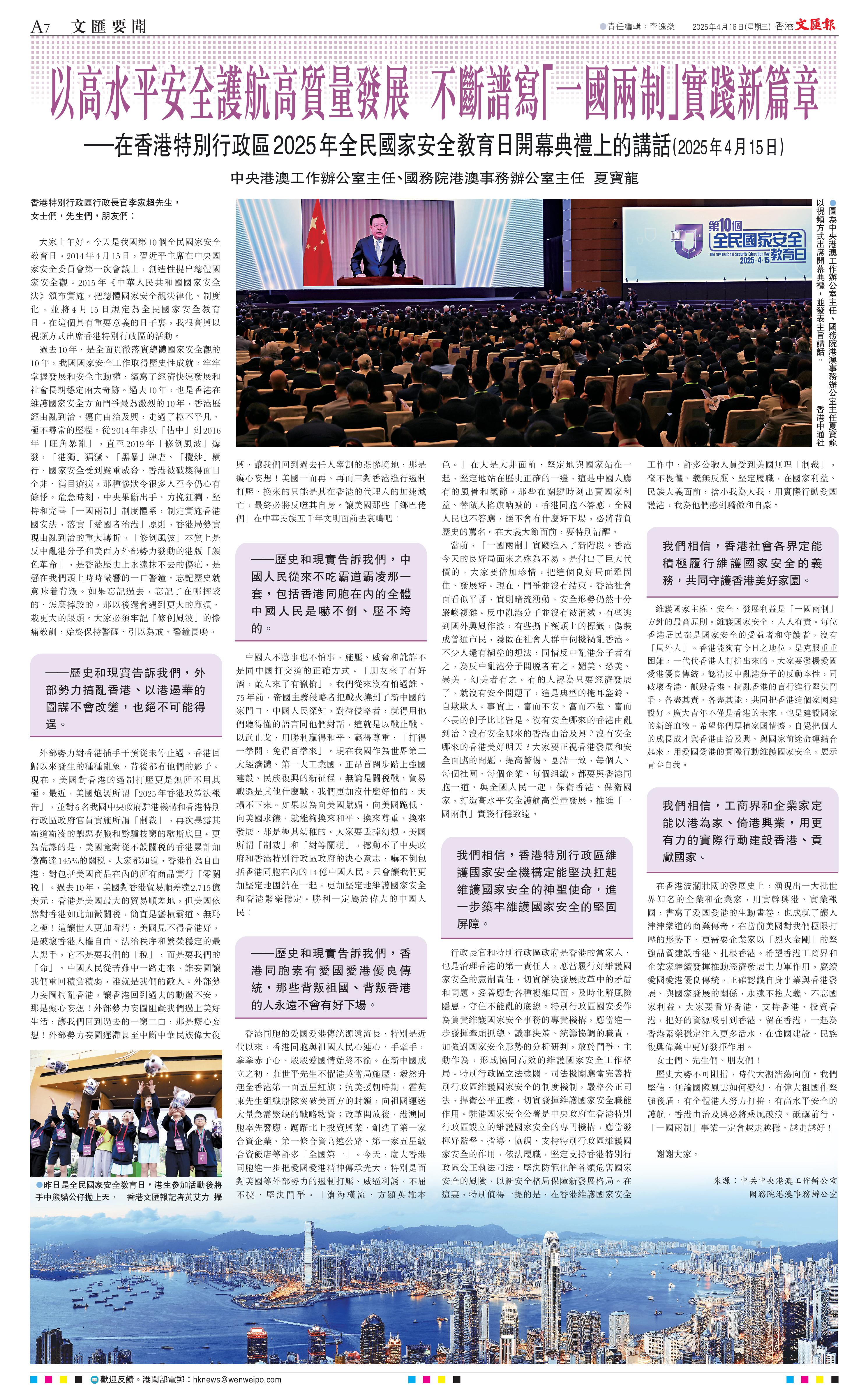 「我們相信,香港特別行政區(qū)維護(hù)國(guó)家安全機(jī)構(gòu)定能堅(jiān)決扛起維護(hù)國(guó)家安全的神圣使命,進(jìn)一步筑牢維護(hù)國(guó)家安全的堅(jiān)固屏障?!瓜膶汖埍硎?,行政長(zhǎng)官和特別行政區(qū)政府是香港的當(dāng)家人,也是治理香港的第一責(zé)任人,應(yīng)當(dāng)履行好維護(hù)國(guó)家安全的憲制責(zé)任,切實(shí)解決發(fā)展改革中的矛盾和問(wèn)題,妥善應(yīng)對(duì)各種復(fù)雜局面,及時(shí)化解風(fēng)險(xiǎn)隱患,守住不能亂的底線。他特別提到,在香港維護(hù)國(guó)家安全工作中,許多公職人員受到美國(guó)無(wú)理制裁,毫不畏懼、義無(wú)反顧、堅(jiān)定履職,在國(guó)家利益、民族大義面前,舍小我為大我,用實(shí)際行動(dòng)愛(ài)國(guó)護(hù)港,為他們感到驕傲和自豪。