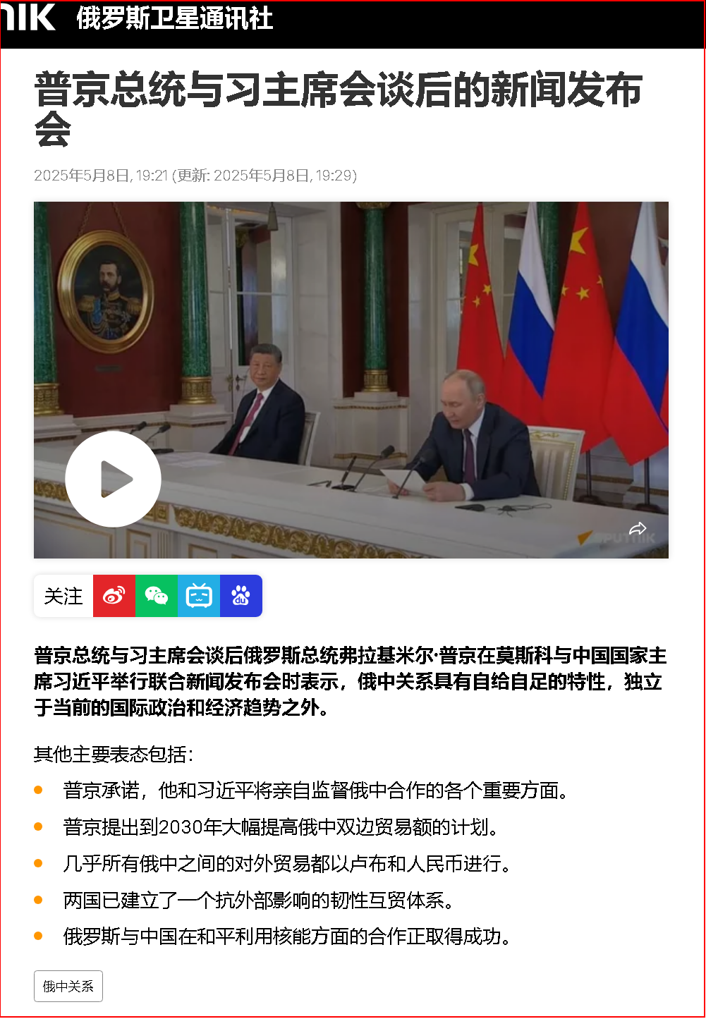 會談后,兩國元首共同簽署《中華人民共和國和俄羅斯聯(lián)邦在紀念中國人民抗日戰(zhàn)爭、蘇聯(lián)偉大衛(wèi)國戰(zhàn)爭勝利和聯(lián)合國成立80周年之際關于進一步深化中俄新時代全面戰(zhàn)略協(xié)作伙伴關系的聯(lián)合聲明》。