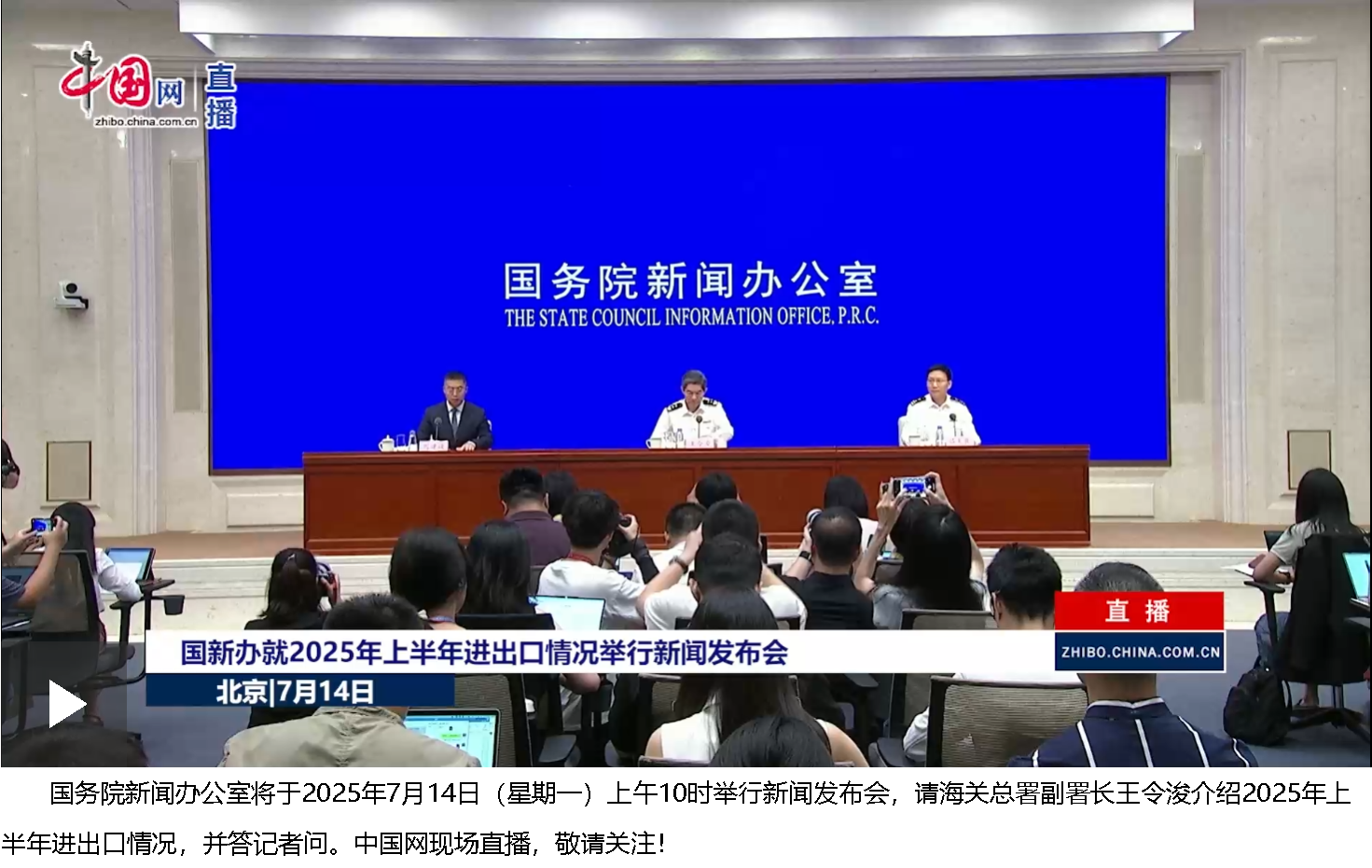 女士們、先生們,大家上午好!歡迎出席國務(wù)院新聞辦新聞發(fā)布會。今天我們進(jìn)行經(jīng)濟(jì)數(shù)據(jù)例行發(fā)布,我們邀請到海關(guān)總署副署長王令浚先生,請他向大家介紹2025年上半年進(jìn)出口情況,并回答大家關(guān)心的問題。出席今天發(fā)布會的還有:海關(guān)總署新聞發(fā)言人、統(tǒng)計(jì)分析司司長呂大良先生。