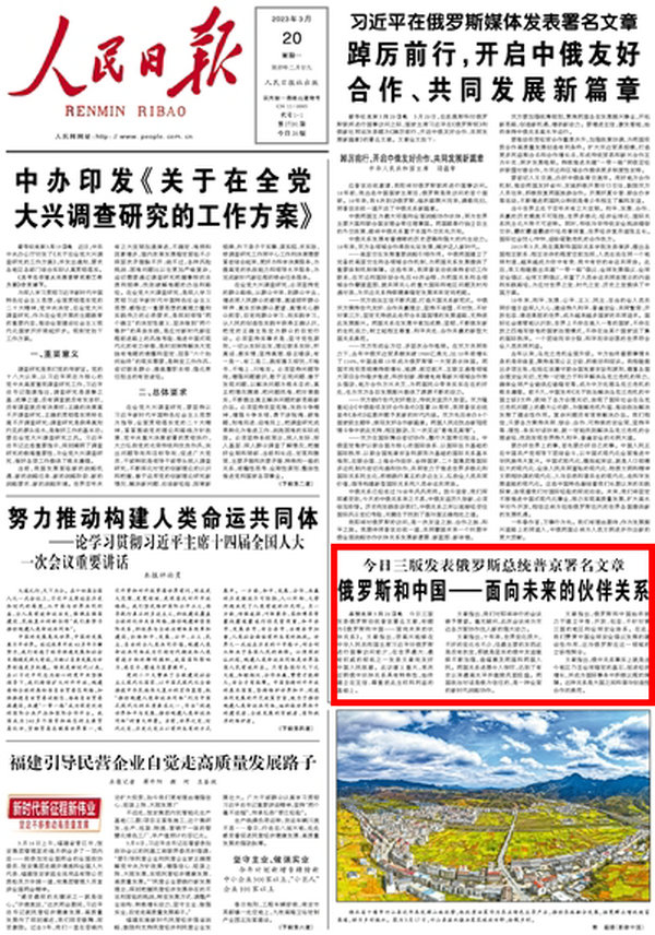 新華社北京3月20日電 在國家主席習(xí)近平對(duì)俄羅斯進(jìn)行國事訪問前夕,俄羅斯總統(tǒng)普京20日在《人民日?qǐng)?bào)》發(fā)表題為《俄羅斯和中國——面向未來的伙伴關(guān)系》的署名文章,向友好的中國人民致意,并表示俄中關(guān)系是大國之間和諧與創(chuàng)造性合作的典范,期待與習(xí)近平主席的會(huì)談為雙邊各方面協(xié)作注入新的強(qiáng)大動(dòng)力。