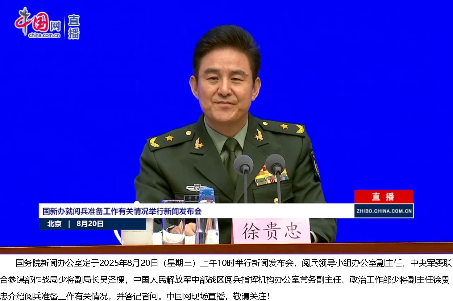 女士們、先生們,大家上午好。歡迎出席國(guó)務(wù)院新聞辦新聞發(fā)布會(huì)。今年是中國(guó)人民抗日戰(zhàn)爭(zhēng)暨世界反法西斯戰(zhàn)爭(zhēng)勝利80周年,9月3日將舉行盛大閱兵式。今天我們很高興邀請(qǐng)到閱兵領(lǐng)導(dǎo)小組辦公室副主任、中央軍委聯(lián)合參謀部作戰(zhàn)局少將副局長(zhǎng)吳澤棵先生,中國(guó)人民解放軍中部戰(zhàn)區(qū)閱兵指揮機(jī)構(gòu)辦公室常務(wù)副主任、政治工作部少將副主任徐貴忠先生,請(qǐng)他們?yōu)榇蠹医榻B閱兵準(zhǔn)備工作有關(guān)情況,并回答大家關(guān)心的問(wèn)題。