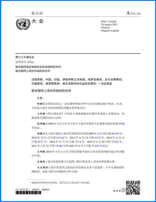 新華社聯(lián)合國9月5日電 第79屆聯(lián)合國大會5日高票通過中國主提的“聯(lián)合國同上海合作組織的合作”決議。包括上合組織所有成員國在內(nèi)的近40國參與共提。