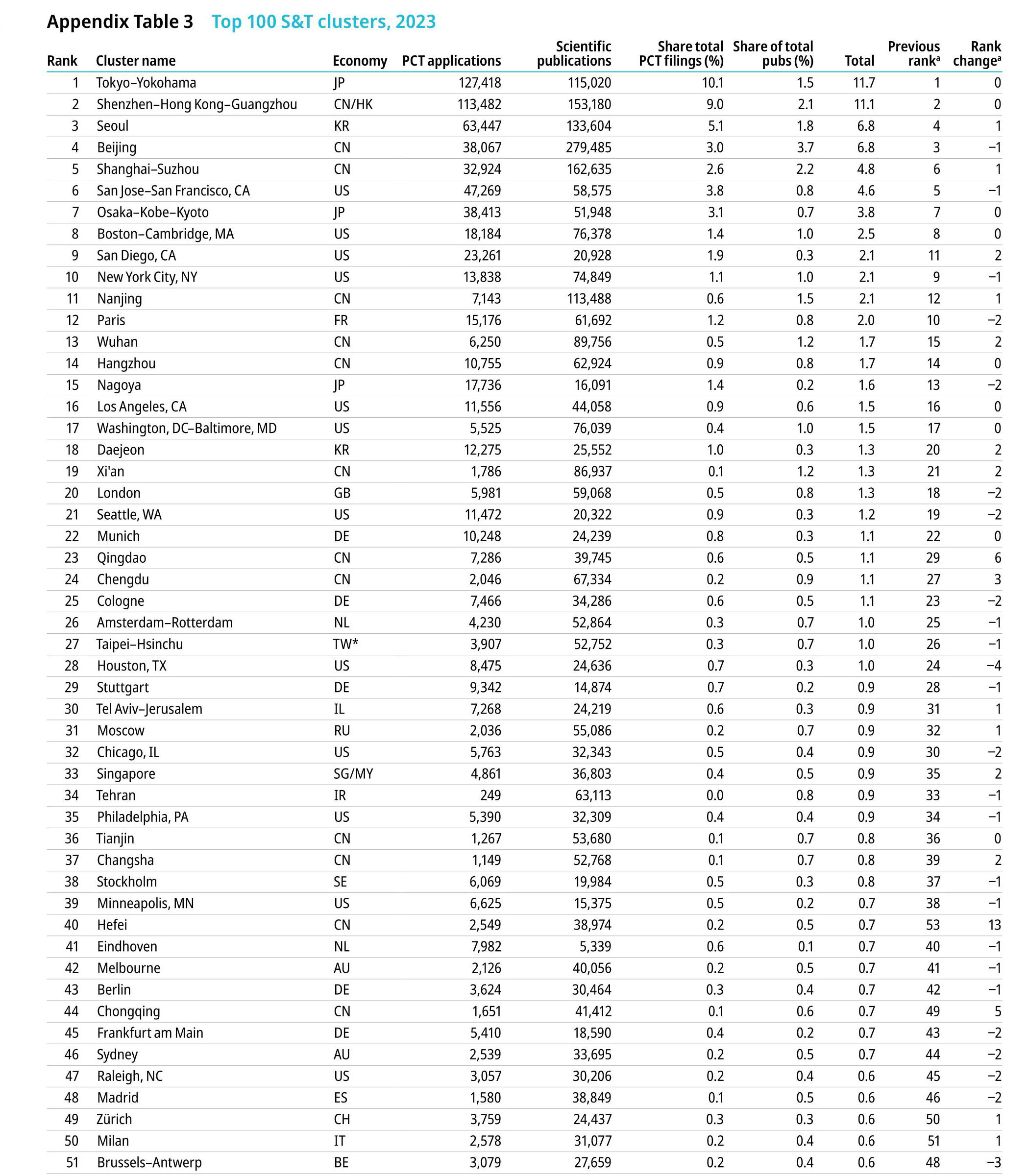 在GII的專題摘錄全球科技集群中,今年呈現(xiàn)出全球科技活動中心東移的特點(diǎn)。全球五大頂級科技集群全部位于東亞,包括東京-橫濱(日本)、深圳-香港-廣州(中國)、首爾(韓國)、北京(中國)和上海-蘇州(中國)。