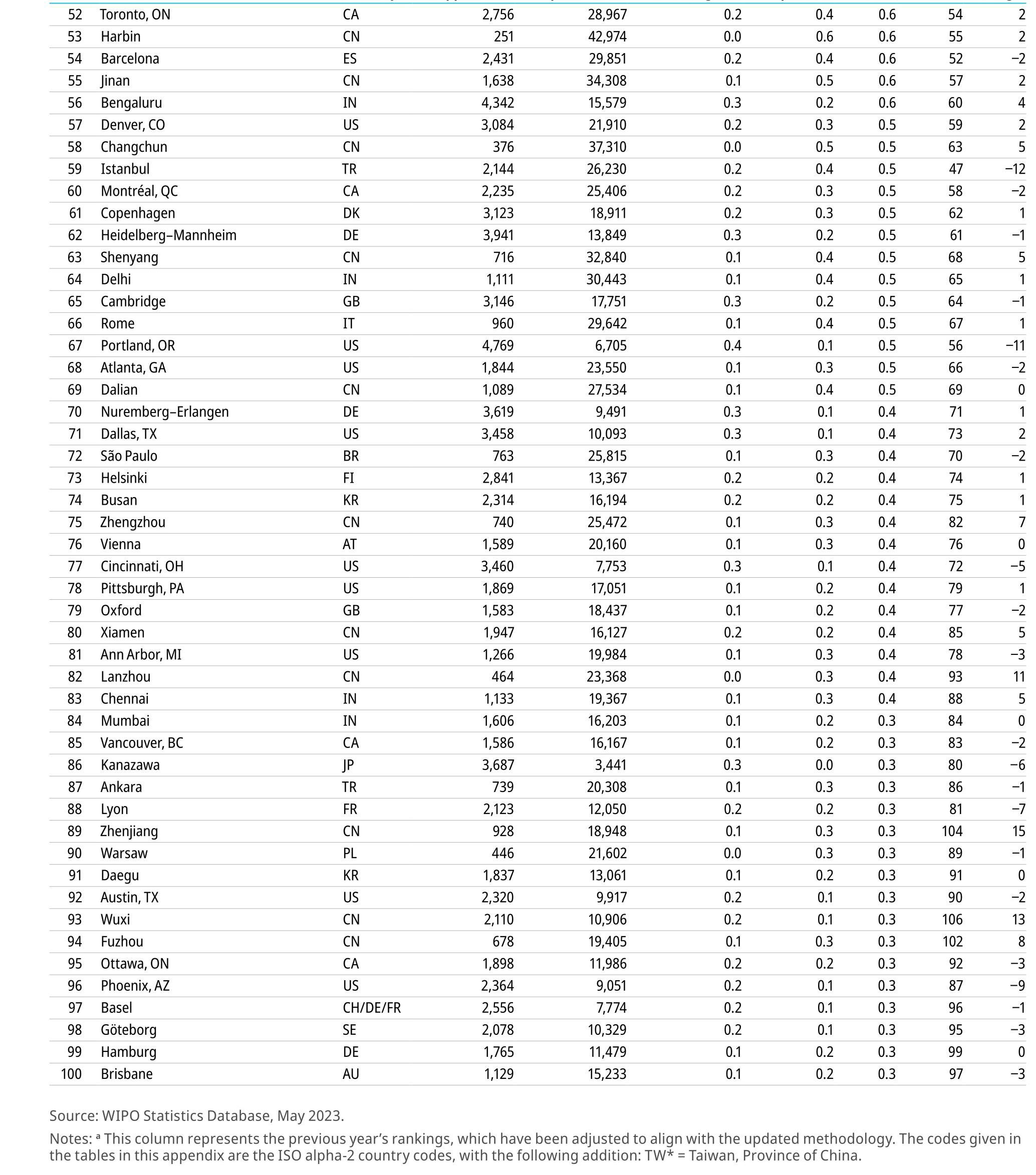 中國有25個科技集群進(jìn)入全球TOP100榜單,成為擁有全球頂級科技集群最多的國家,并在前五科技集群中占了三位。這25個集群分別為:深圳-香港-廣州(第2位)、北京(4)、上海-蘇州(5)、南京(11)、武漢(13)、杭州(14)、西安(19)、青島(23)、成都(24)、臺北-新竹(27)、天津(36)、長沙(37)、合肥(40)、重慶(44)、哈爾濱(53)、濟(jì)南(55)、長春(58)、沈陽(63)、大連(69)、鄭州(75)、廈門(80)、蘭州(82)、鎮(zhèn)江(89)、無錫(93)、福州(94)。成都本次排名比2022年GII著錄排名上升5位。