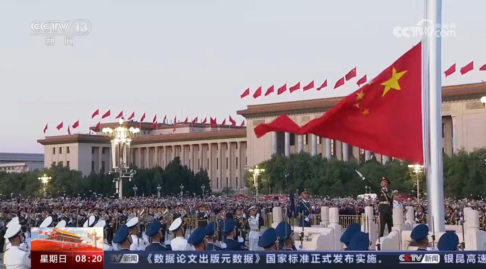 “向國(guó)旗——敬禮!”6時(shí)9分,隨著儀仗隊(duì)員的口號(hào)聲,《義勇軍進(jìn)行曲》響徹天安門廣場(chǎng)。