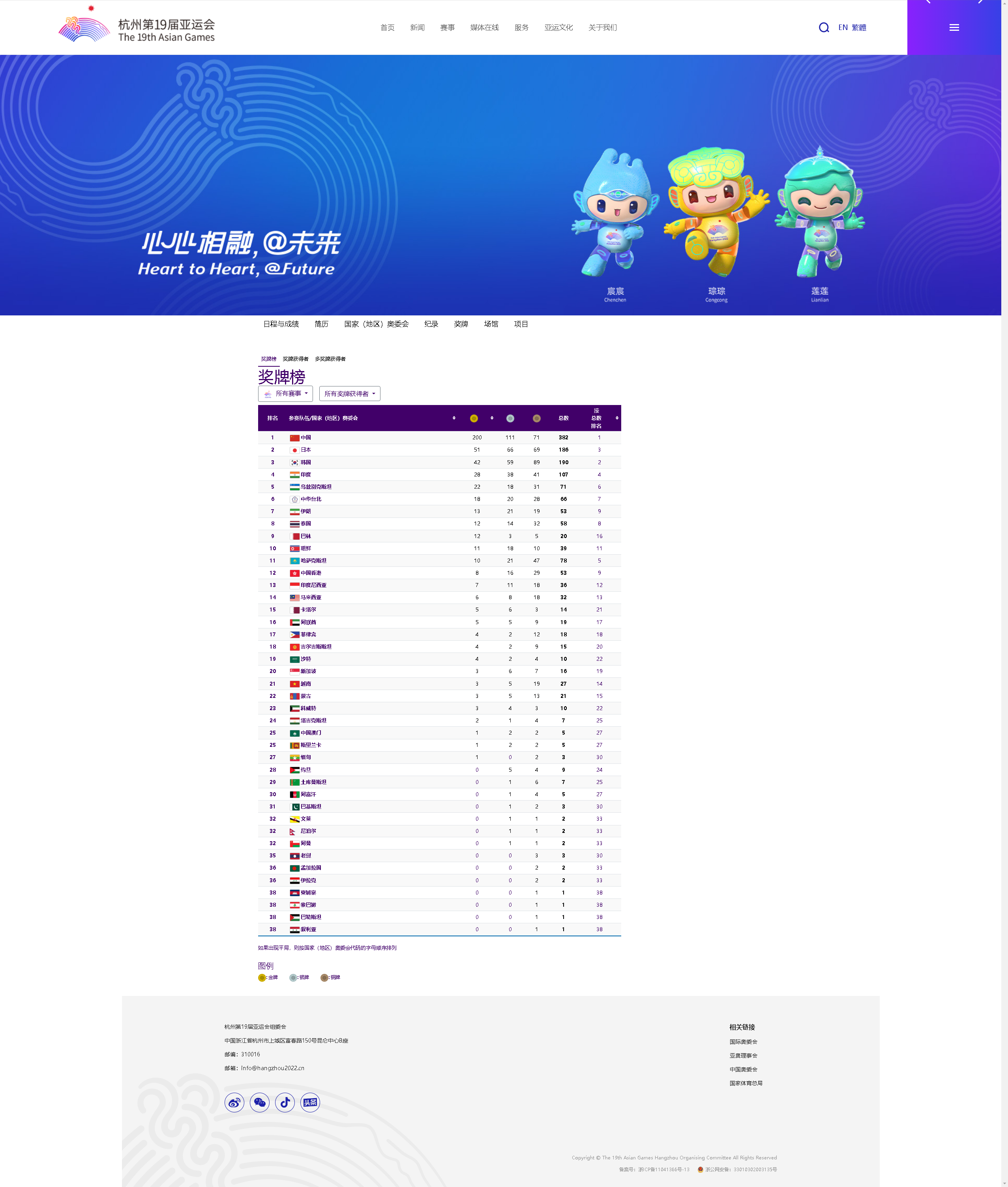 獎牌榜上,中國隊以200金111銀71銅位居第一,排在后面的日本隊獲得51金66銀69銅,韓國隊獲得42金59銀89銅。
