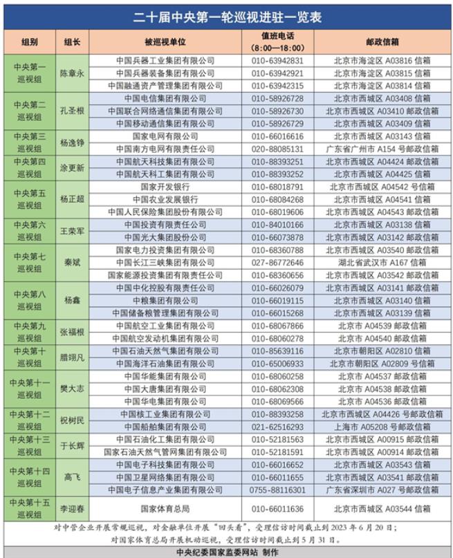 新華社北京10月10日電 經(jīng)黨中央批準(zhǔn),二十屆中央第二輪巡視將對(duì)科學(xué)技術(shù)部、工業(yè)和信息化部、國(guó)務(wù)院國(guó)有資產(chǎn)監(jiān)督管理委員會(huì)、國(guó)家國(guó)防科技工業(yè)局、國(guó)家煙草專(zhuān)賣(mài)局和中國(guó)第一汽車(chē)集團(tuán)有限公司、東風(fēng)汽車(chē)集團(tuán)有限公司、中國(guó)一重集團(tuán)有限公司、中國(guó)機(jī)械工業(yè)集團(tuán)有限公司、哈爾濱電氣集團(tuán)有限公司、中國(guó)東方電氣集團(tuán)有限公司、鞍鋼集團(tuán)有限公司、中國(guó)寶武鋼鐵集團(tuán)有限公司、中國(guó)礦產(chǎn)資源集團(tuán)有限公司、中國(guó)鋁業(yè)集團(tuán)有限公司、中國(guó)遠(yuǎn)洋海運(yùn)集團(tuán)有限公司、中國(guó)航空集團(tuán)有限公司、中國(guó)東方航空集團(tuán)有限公司、中國(guó)南方航空集團(tuán)有限公司、中國(guó)五礦集團(tuán)有限公司、中國(guó)通用技術(shù)(集團(tuán))控股有限責(zé)任公司、中國(guó)建筑集團(tuán)有限公司、中國(guó)南水北調(diào)集團(tuán)有限公司、國(guó)家開(kāi)發(fā)投資集團(tuán)有限公司、招商局集團(tuán)有限公司、華潤(rùn)(集團(tuán))有限公司、中國(guó)旅游集團(tuán)有限公司、中國(guó)商用飛機(jī)有限責(zé)任公司、中國(guó)郵政集團(tuán)有限公司、中國(guó)出版集團(tuán)有限公司、紫荊文化集團(tuán)有限公司等31家單位黨委(黨組)開(kāi)展常規(guī)巡視;對(duì)國(guó)家鐵路局黨組、中國(guó)國(guó)家鐵路集團(tuán)有限公司黨組開(kāi)展巡視“回頭看”。