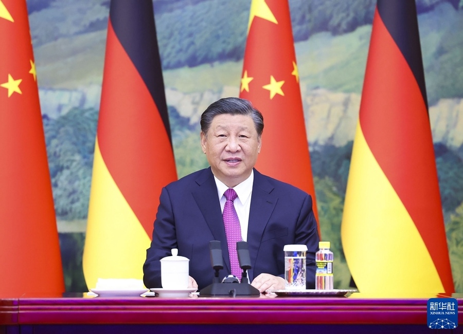 11月3日下午,國家主席習近平同德國總理朔爾茨舉行視頻會晤。新華社記者 黃敬文 攝