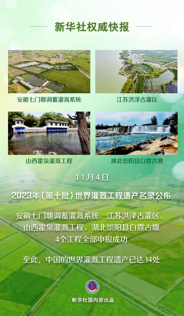 新華社北京11月4日電(記者劉詩平、陳冬書)安徽七門堰調(diào)蓄灌溉系統(tǒng)、江蘇洪澤古灌區(qū)、山西霍泉灌溉工程、湖北崇陽縣白霓古堰4日成功入選2023年(第十批)世界灌溉工程遺產(chǎn)名錄。至此,我國的世界灌溉工程遺產(chǎn)達(dá)到34處。