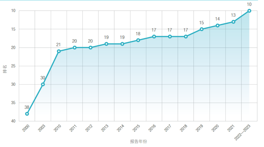 結(jié)果顯示,2023年,中國(guó)國(guó)家創(chuàng)新指數(shù)綜合排名世界第10位,較上期提升3位,是唯一進(jìn)入前15位的發(fā)展中國(guó)家。