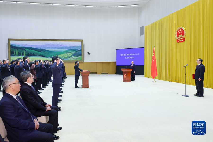 宣誓后,國務院總理李強作了講話。他強調,誓詞雖短,但字字千鈞,希望大家把錚錚誓言銘記于心、踐之于行,忠于憲法、忠于祖國、忠于人民,不辜負黨和人民的重托。要堅持用習近平新時代中國特色社會主義思想凝心鑄魂,深刻領悟“兩個確立”的決定性意義,堅決做到“兩個維護”,不斷提高政治判斷力、政治領悟力、政治執(zhí)行力,當好貫徹黨中央決策部署的執(zhí)行者、行動派、實干家。要倍加珍惜黨和人民賦予的平臺,以奮發(fā)有為的精神狀態(tài)干事創(chuàng)業(yè),緊緊圍繞推進高質量發(fā)展這個首要任務,持續(xù)深化改革、擴大開放、推動創(chuàng)新、改善民生,勇于打破常規(guī),善于開辟新局,抓住主要矛盾綜合施策,聚焦瓶頸制約持續(xù)攻堅,以實干實績踐行誓言。要牢固樹立正確的權力觀、政績觀、事業(yè)觀,嚴格按照法定權限和程序履行職責、行使權力、承擔責任,始終繃緊廉潔自律這根弦,時時處處嚴格要求自己,堅決反對形式主義、官僚主義,大力弘揚勤儉節(jié)約、艱苦奮斗的優(yōu)良作風,為全面建設社會主義現(xiàn)代化國家、實現(xiàn)中華民族偉大復興中國夢不懈奮斗。