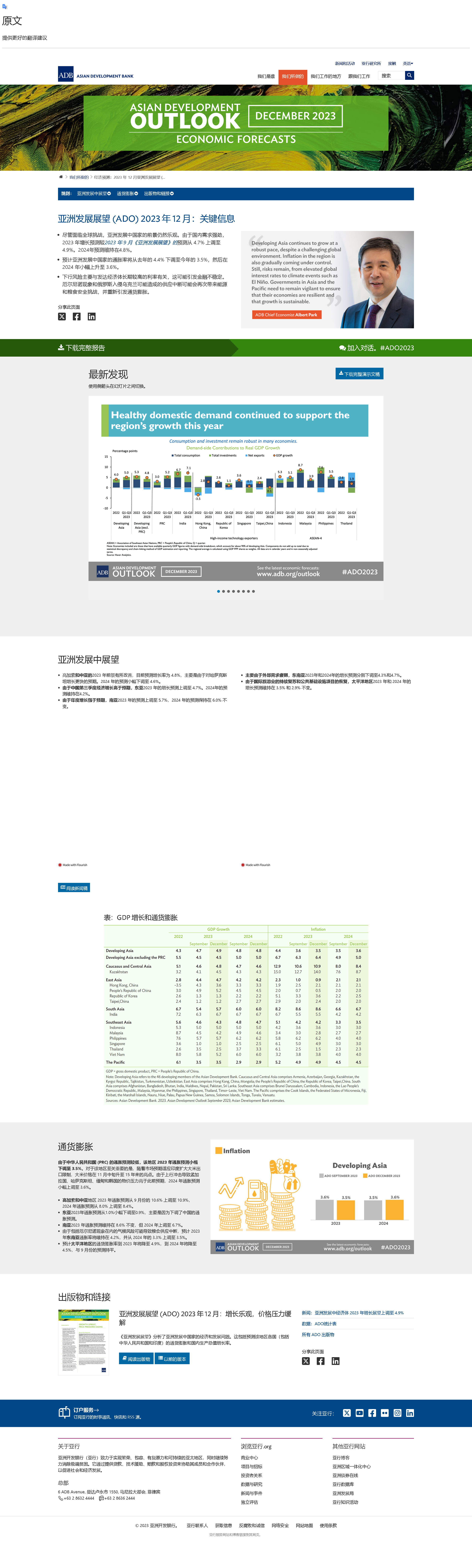報告預(yù)計,亞太地區(qū)發(fā)展中經(jīng)濟(jì)體2023年將增長4.9%,較9月預(yù)期上調(diào)0.2個百分點;2024年將增長4.8%,與此前預(yù)期持平。