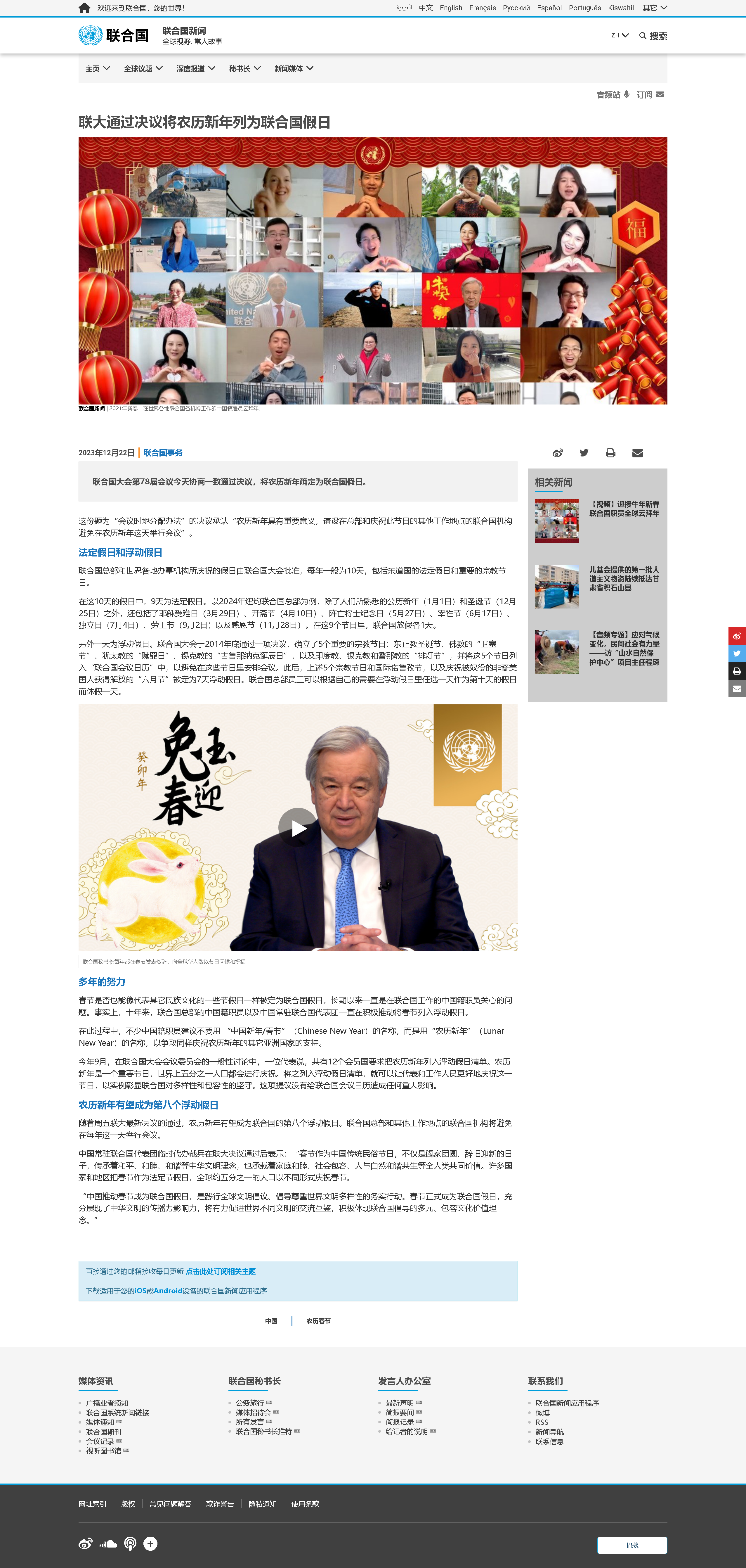 聯(lián)合國(guó)除了東道國(guó)的重要法定假日外,可由聯(lián)大通過(guò)決議,把世界范圍內(nèi)廣泛慶祝的節(jié)日確定為聯(lián)合國(guó)假日,在當(dāng)天盡量避免安排會(huì)議活動(dòng)。聯(lián)合國(guó)秘書(shū)長(zhǎng)每年都發(fā)表春節(jié)賀辭,向中國(guó)及所有慶祝春節(jié)(農(nóng)歷新年)的各國(guó)人民致以節(jié)日問(wèn)候和祝福。