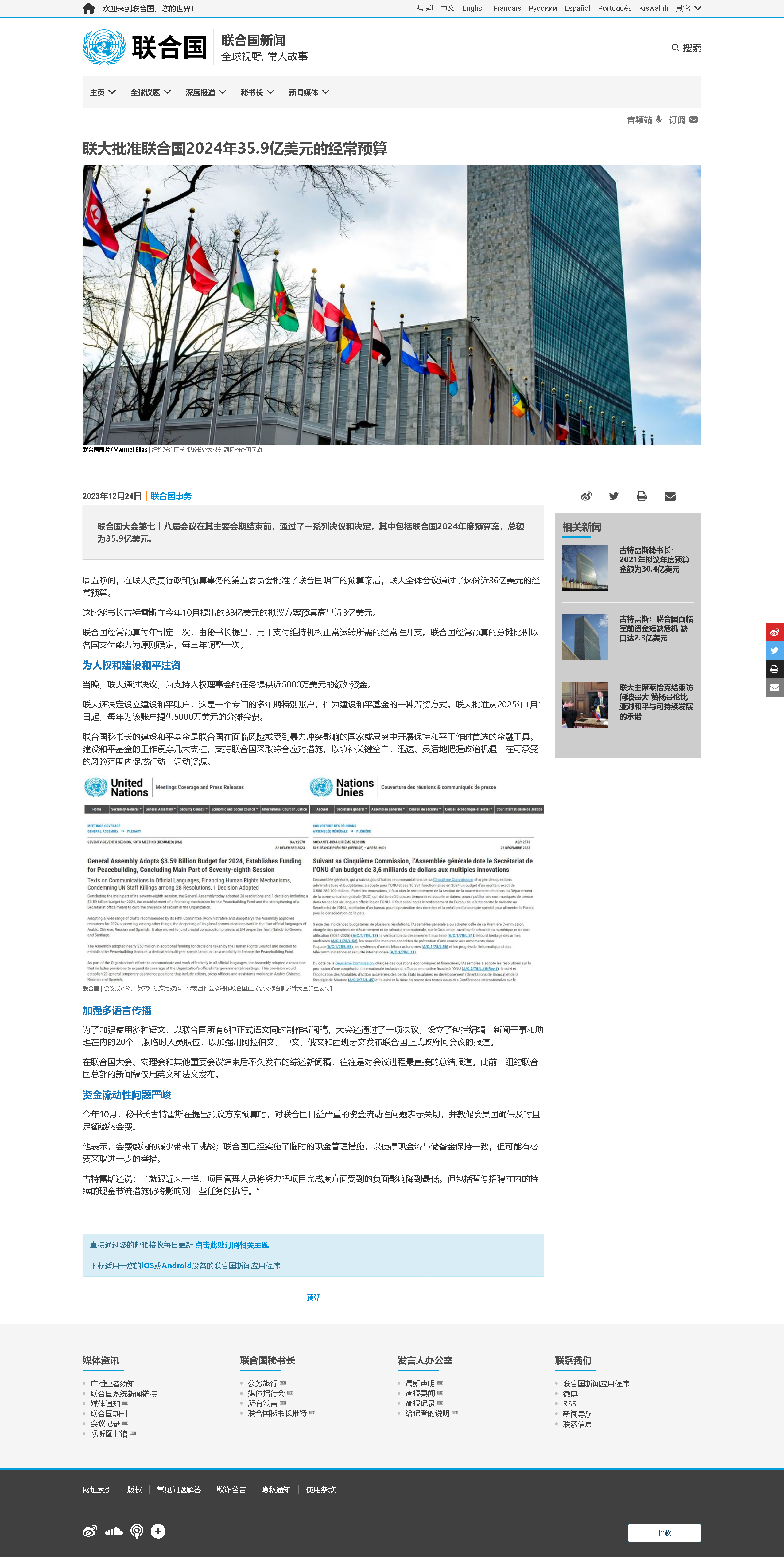 新華社聯(lián)合國12月24日電(記者尚緒謙)聯(lián)合國新聞網(wǎng)站24日消息,第78屆聯(lián)合國大會已批準(zhǔn)總額約為35.9億美元的2024年度聯(lián)合國常規(guī)預(yù)算,略高于2023年度預(yù)算。