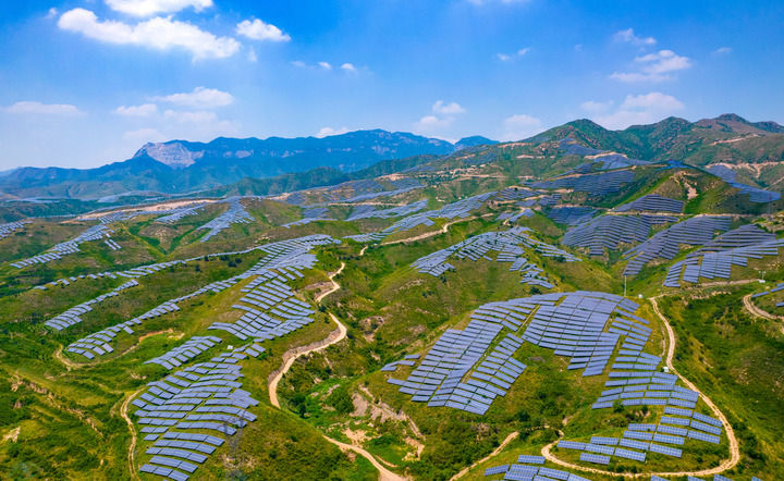 2023年7月18日,在山西省運城市稷山縣100MW光儲一體化項目基地,一排排整齊的光伏板與遠處的青山交相輝映。近年來,稷山縣因地制宜流轉荒山荒坡發(fā)展光伏產業(yè),增加農民收入,助力鄉(xiāng)村振興。(山西省委辦公廳 供圖)