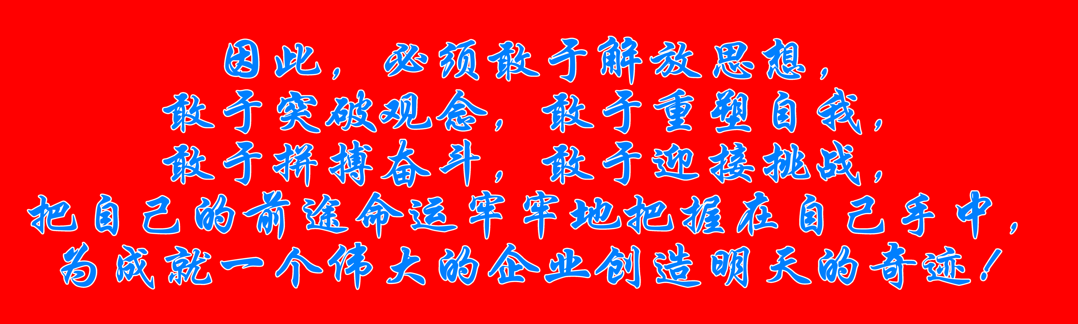 因此,必須敢于解放思想,敢于突破觀念,敢于重塑自我,敢于拼搏奮斗,敢于迎接挑戰(zhàn),把自己的前途命運(yùn)牢牢地把握在自己手中,為成就一個(gè)偉大的企業(yè)創(chuàng)造明天的奇跡!