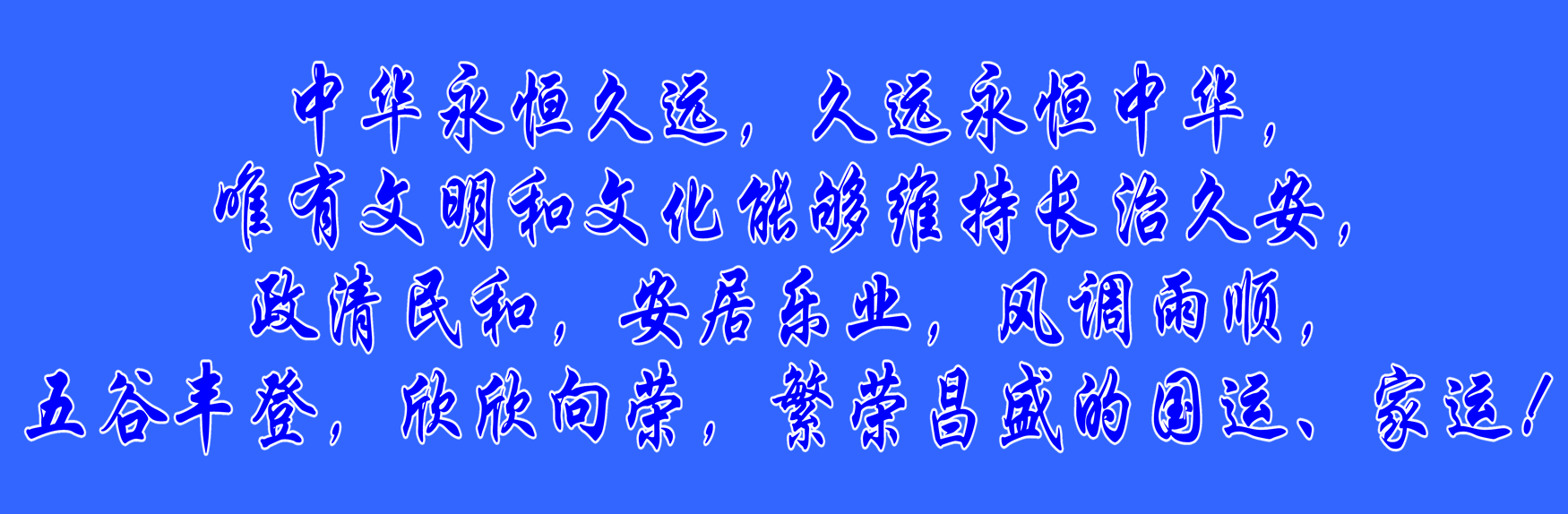 中華永恒久遠(yuǎn),久遠(yuǎn)永恒中華,唯有文明和文化能夠維持長(zhǎng)治久安,政清民和,安居樂(lè)業(yè),風(fēng)調(diào)雨順,五谷豐登,欣欣向榮,繁榮昌盛的國(guó)運(yùn)、家運(yùn)!
