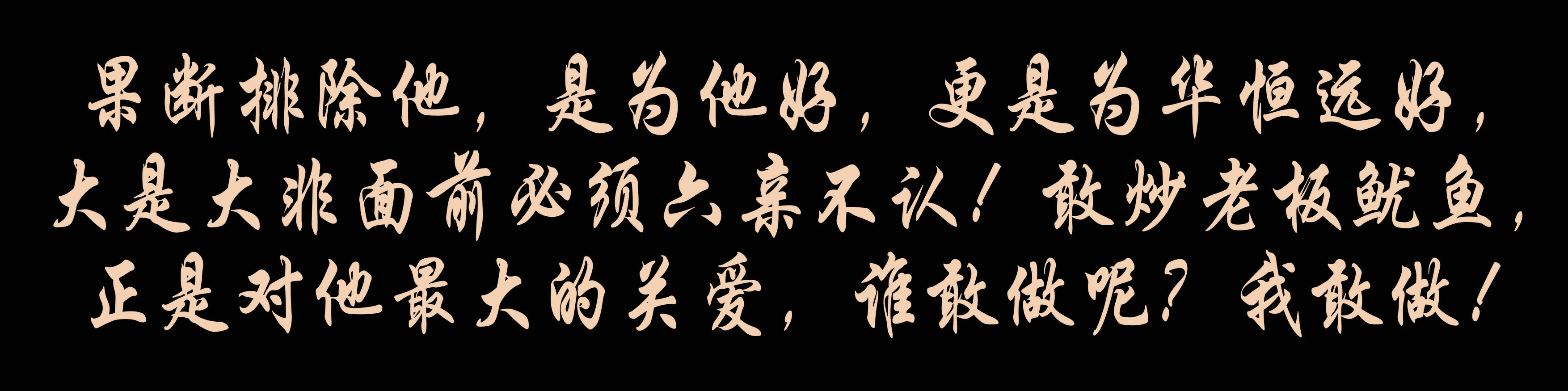 機(jī)遇的到來,就是一瞬之間,稍縱即逝,大事一定要當(dāng)真,不可含含糊糊!千萬不敢像我批評的那個人一樣,糊里糊涂,自以為是,栽了多少跟頭都不長一點記性!果斷排除他,是為他好,更是為華恒遠(yuǎn)好,大是大非面前必須六親不認(rèn)!敢炒老板魷魚,正是對他最大的關(guān)愛,誰敢做呢?我敢做!