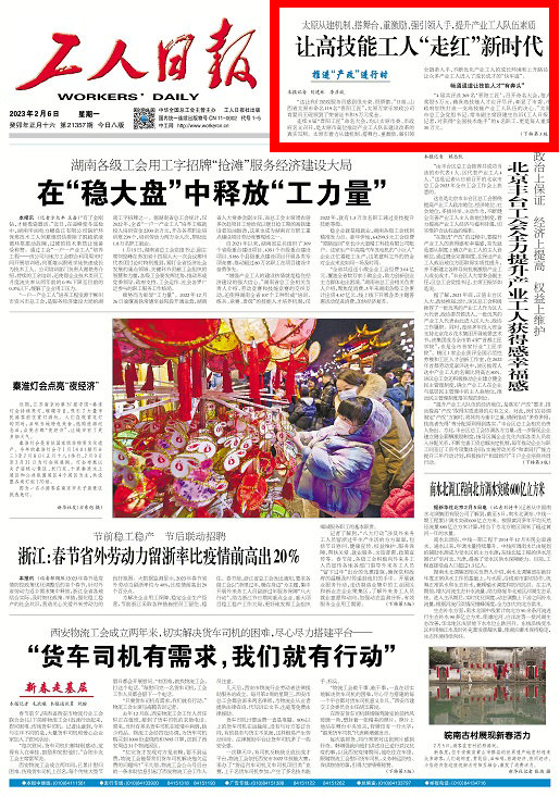 本報(bào)訊 2月6日,《工人日?qǐng)?bào)》第一版“推進(jìn)‘產(chǎn)改’進(jìn)行時(shí)”欄目以《太原從建機(jī)制、搭舞臺(tái)、重激勵(lì)、強(qiáng)引領(lǐng)入手,提升產(chǎn)業(yè)工人隊(duì)伍素質(zhì) 讓高技能工人“走紅”新時(shí)代》為題,報(bào)道我市不斷優(yōu)化產(chǎn)業(yè)工人的成長(zhǎng)環(huán)境和上升路徑,讓眾多產(chǎn)業(yè)工人駛?cè)氤砷L(zhǎng)成才的“快車道”。