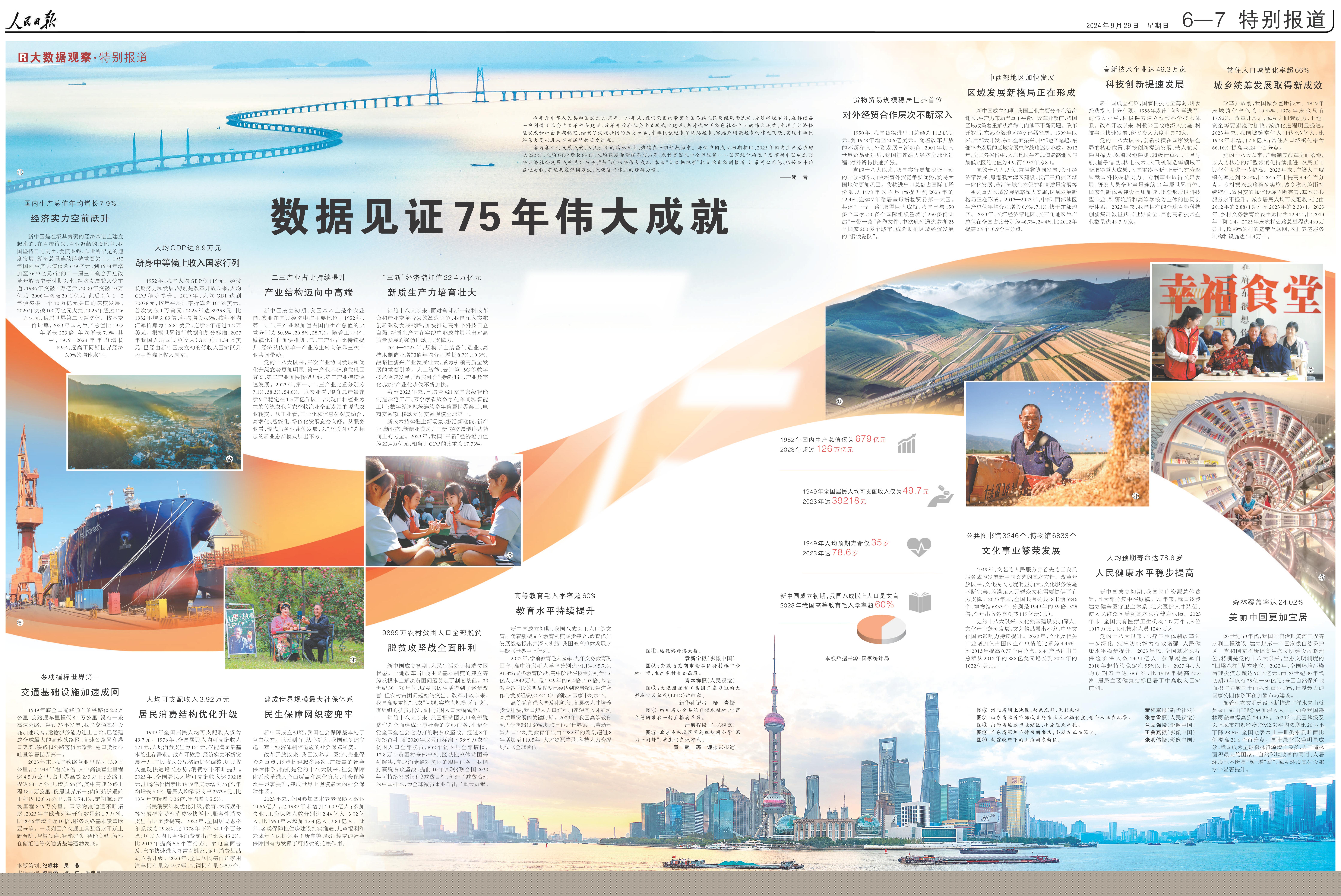各行各業(yè)的發(fā)展成就,人民生活的蒸蒸日上,濃縮在一組組數(shù)據(jù)中。與新中國成立初期相比,2023年國內生產(chǎn)總值增長223倍、人均GDP增長89倍、人均預期壽命提高43.6歲、農(nóng)村貧困人口全部脫貧……國家統(tǒng)計局近日發(fā)布新中國成立75年經(jīng)濟社會發(fā)展成就系列報告,“數(shù)”說75年偉大成就,本版“大數(shù)據(jù)觀察”欄目推出特別報道,記錄同心同德、艱苦奮斗的奮進歷程,匯聚共襄強國建設、民族復興偉業(yè)的磅礴力量。