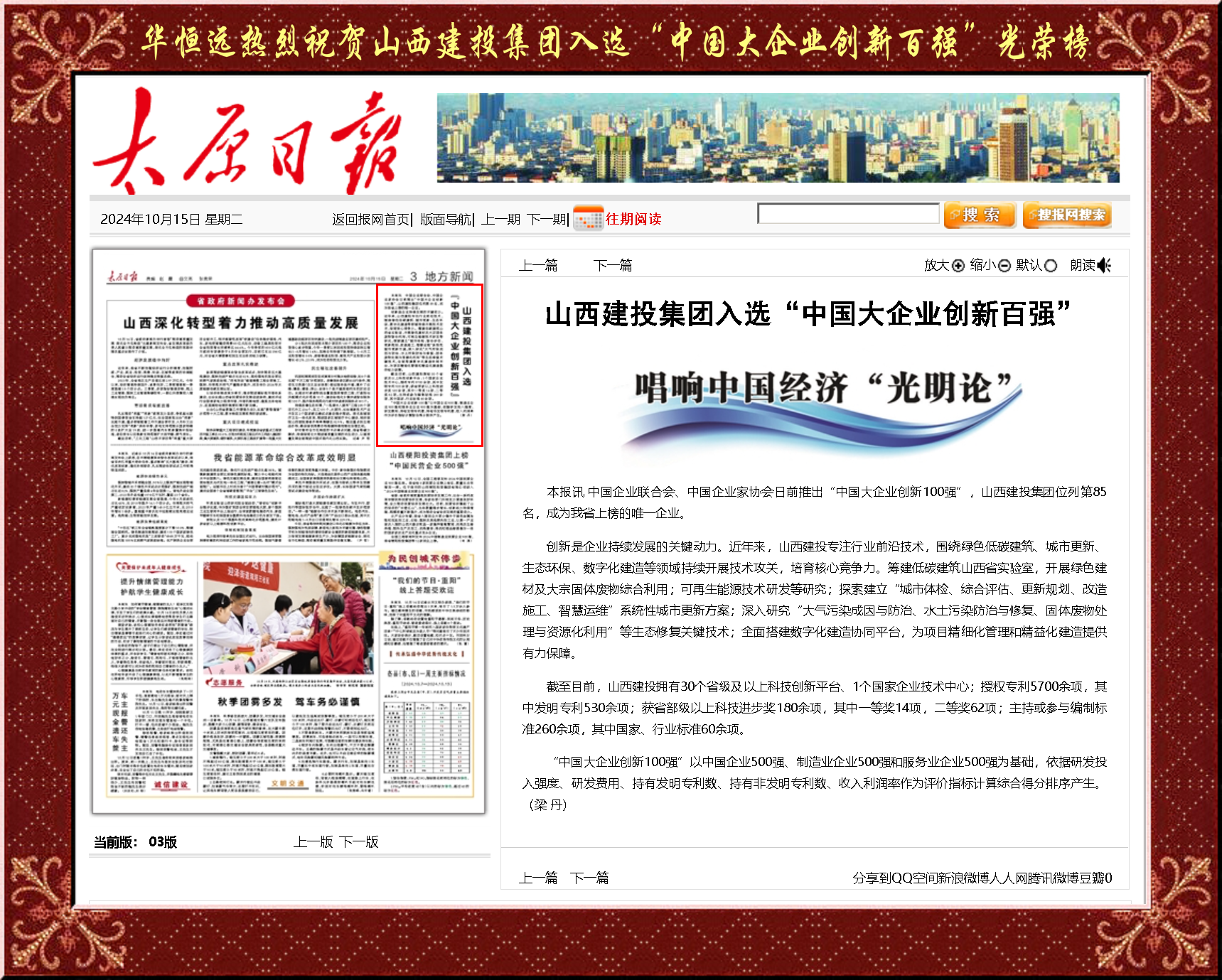 截至目前,山西建投擁有30個省級及以上科技創(chuàng)新平臺、1個國家企業(yè)技術(shù)中心;授權(quán)專利5700余項,其中發(fā)明專利530余項;獲省部級以上科技進步獎180余項,其中一等獎14項,二等獎62項;主持或參與編制標(biāo)準(zhǔn)260余項,其中國家、行業(yè)標(biāo)準(zhǔn)60余項。