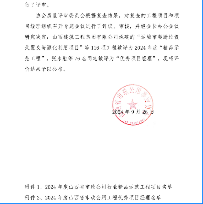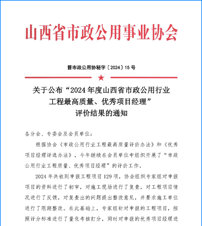 近日,山西省市政公用事業(yè)協(xié)會(huì)公布2024年度山西省市政公用行業(yè)精品示范工程榮譽(yù)和山西省市政公用行業(yè)工程最高質(zhì)量、優(yōu)秀項(xiàng)目經(jīng)理的評(píng)價(jià)結(jié)果。總承包公司承建的祥和路改造工程EPC工程項(xiàng)目榮獲“精品示范工程獎(jiǎng)”,職工武舉國(guó)榮獲“優(yōu)秀項(xiàng)目經(jīng)理”榮譽(yù)稱號(hào)。