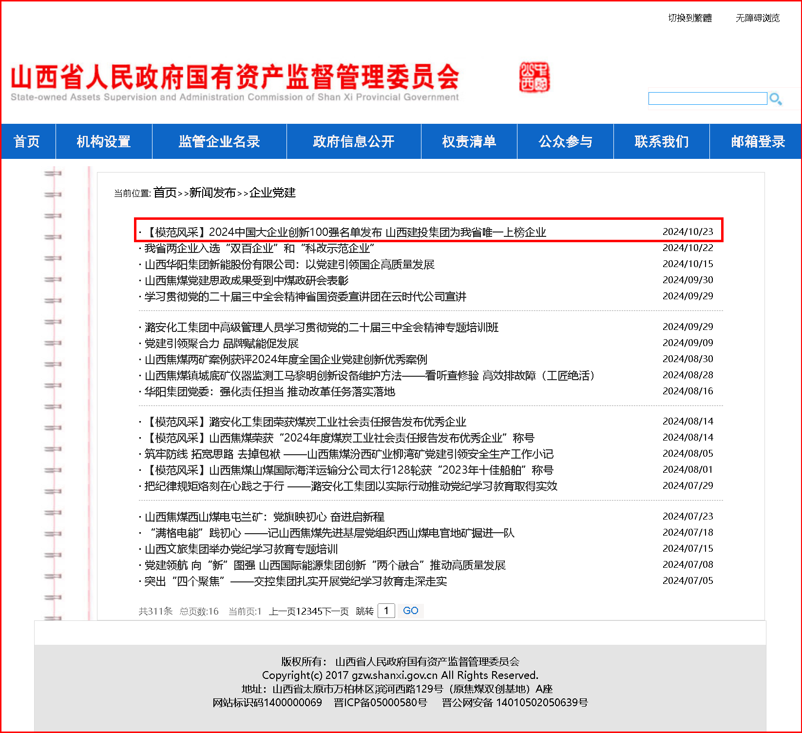1 【模范風(fēng)采】2024中國(guó)大企業(yè)創(chuàng)新100強(qiáng)名單發(fā)布山西建投集團(tuán)為我省唯一上榜企業(yè) 2024/10/23
