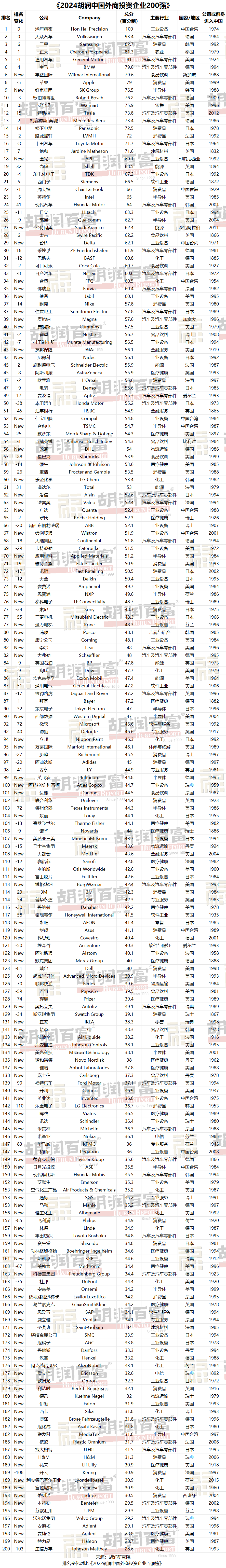 胡潤研究院發(fā)布《2024胡潤中國外商投資企業(yè)200強》