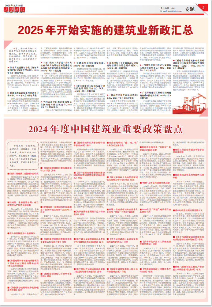 鄉(xiāng)村振興、節(jié)能降碳、城市更新、招標投標、房地產(chǎn)融資、城中村改造……2024年,國家政府部門相繼出臺一系列與建筑業(yè)密切相關的政策,深刻影響著行業(yè)發(fā)展。