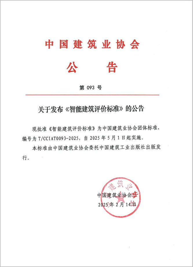現(xiàn)批準《智能建筑評價標準》為中國建筑業(yè)協(xié)會團體標準,編號為T/CCIAT0093-2025,自2025年5月1日起實施。