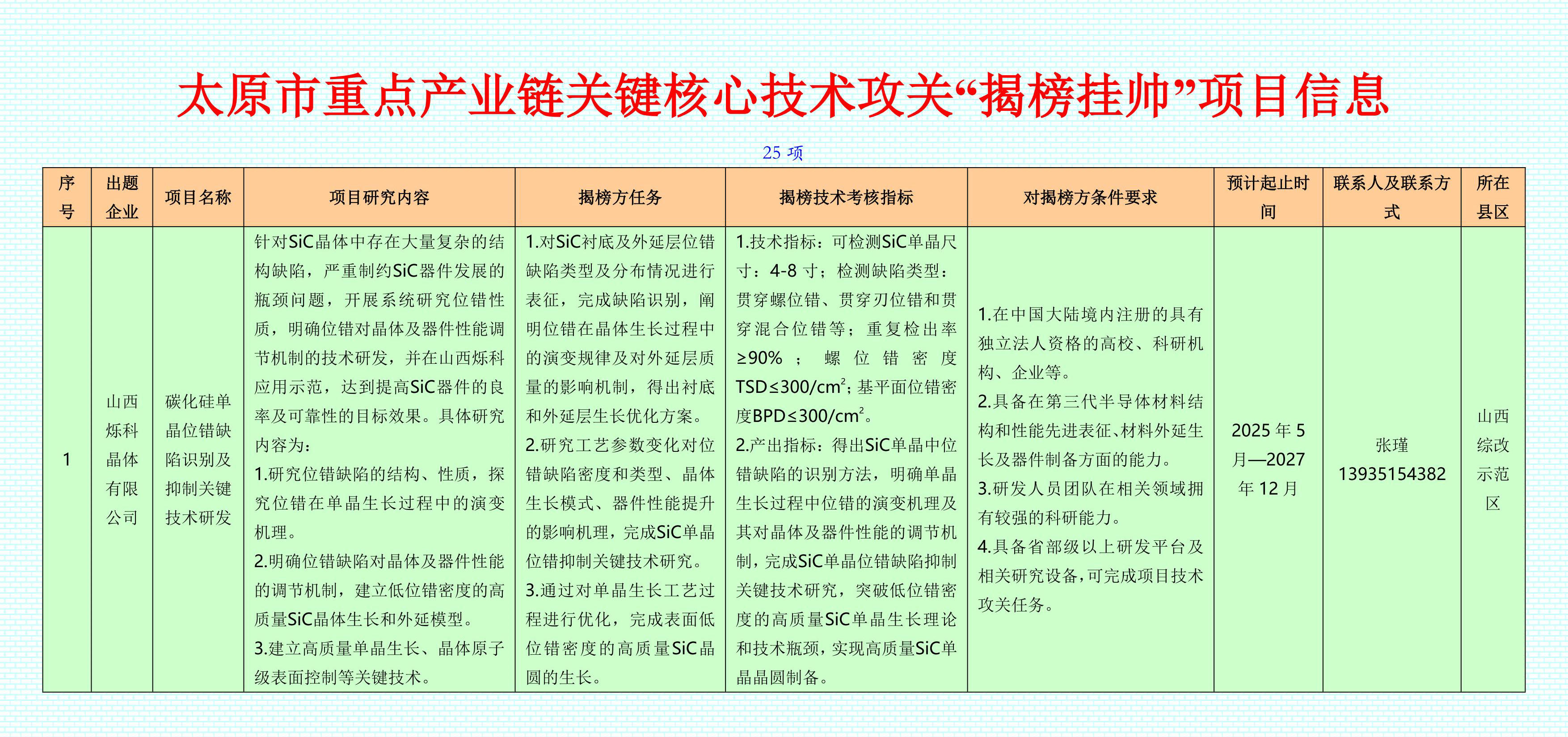 1 山西爍科晶體有限公司 碳化硅單晶位錯(cuò)缺陷識(shí)別及抑制關(guān)鍵技術(shù)研發(fā) 山西綜改示范區(qū)