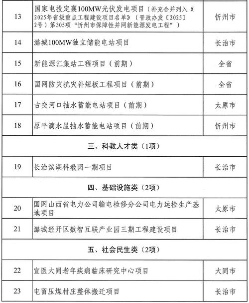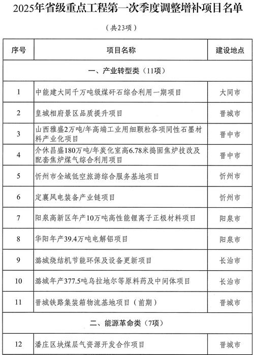 近日,山西發(fā)改委官網(wǎng)發(fā)布2025年省級重點工程第一次季度調(diào)整項目名單,本次共新增23個重點項目。其中,產(chǎn)業(yè)轉(zhuǎn)型類11項,能源革命類7項,科教人才類1項,基礎(chǔ)設(shè)施類2項,社會民生類2項。