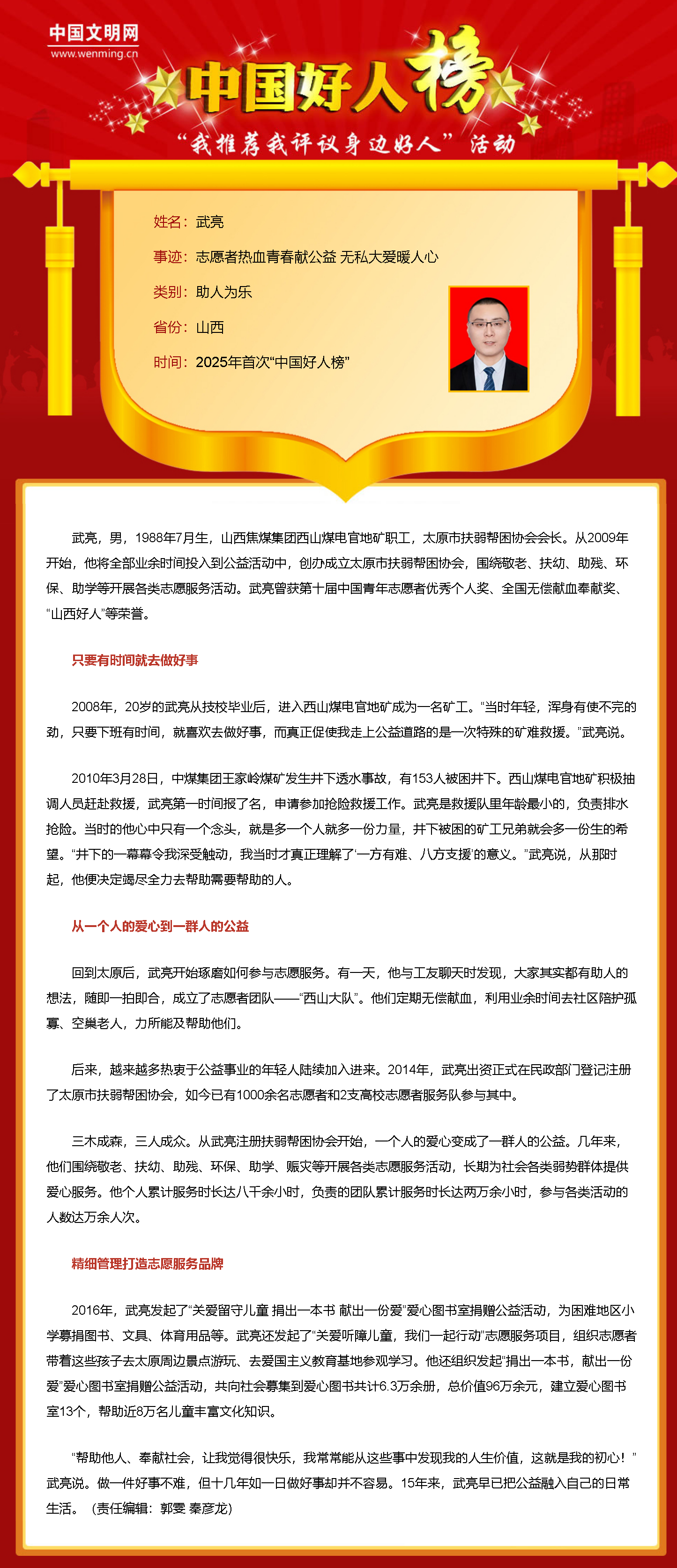 6月24日,2025年首次“中國(guó)好人榜”發(fā)布儀式暨全國(guó)道德模范與身邊好人現(xiàn)場(chǎng)交流活動(dòng)在河南省安陽(yáng)市舉辦。經(jīng)各地推薦、網(wǎng)友評(píng)議和專家評(píng)審等環(huán)節(jié),共有152人(組)身邊好人光榮上榜。太原市扶弱幫困協(xié)會(huì)會(huì)長(zhǎng)武亮因助人為樂(lè)上榜,是太原市也是山西省唯一獲此殊榮者。
