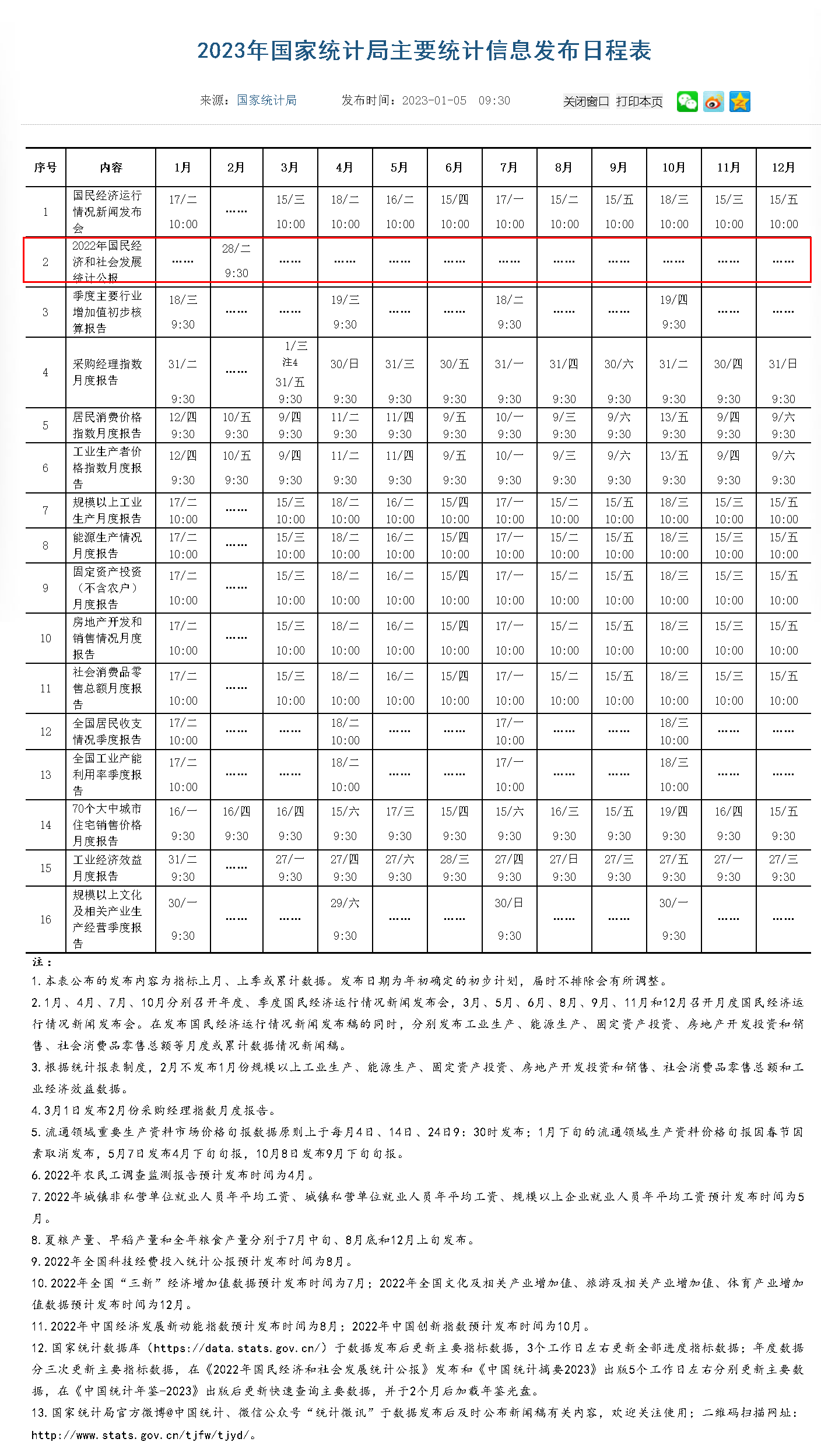 2023年國家統(tǒng)計(jì)局主要統(tǒng)計(jì)信息發(fā)布日程表