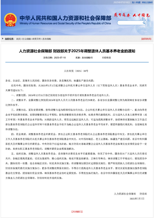 日前,人力資源社會(huì)保障部、財(cái)政部印發(fā)《關(guān)于2025年調(diào)整退休人員基本養(yǎng)老金的通知》。具體如何調(diào)整,一起來了解一下。