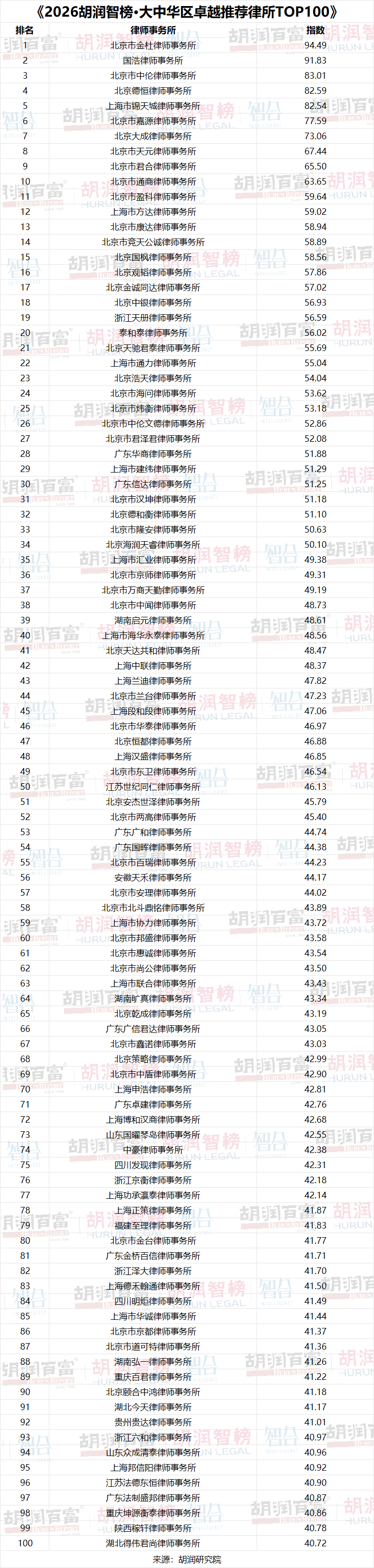 《2026胡潤(rùn)智榜·大中華區(qū)卓越推薦律所TOP100》前五名