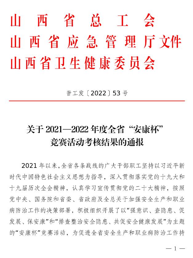 在2021-2022年“安康杯”競賽活動中,一大批先進集體和優(yōu)秀個人脫穎而出,為促進全省安全生產和職業(yè)病防治工作持續(xù)穩(wěn)步好轉作出了積極貢獻。為激勵先進、樹立典型,進一步調動廣大職工干事創(chuàng)業(yè)的積極性,省總工會、省應急管理廳和省衛(wèi)生健康委員會決定對山西焦煤西山煤電集團有限責任公司東曲礦等10個 “安全明星企業(yè)”、國家能源集團神東煤炭集團保德煤礦大學生智能化采煤班等10個“安全示范班組”、長治市潞城區(qū)應急管理局安全公益宣教基地安全志愿者宋衛(wèi)國等10名“安全衛(wèi)士”以及太原西北二環(huán)高速公路發(fā)展有限公司等88個“優(yōu)勝單位”、山西金蘭化工股份有限公司包裝車間甲班等50個“優(yōu)勝班組”、中國定武集團工會干事安靜等60名“安全標兵”、華新燃氣集團有限公司等30個“優(yōu)秀組織單位”進行通報表揚。