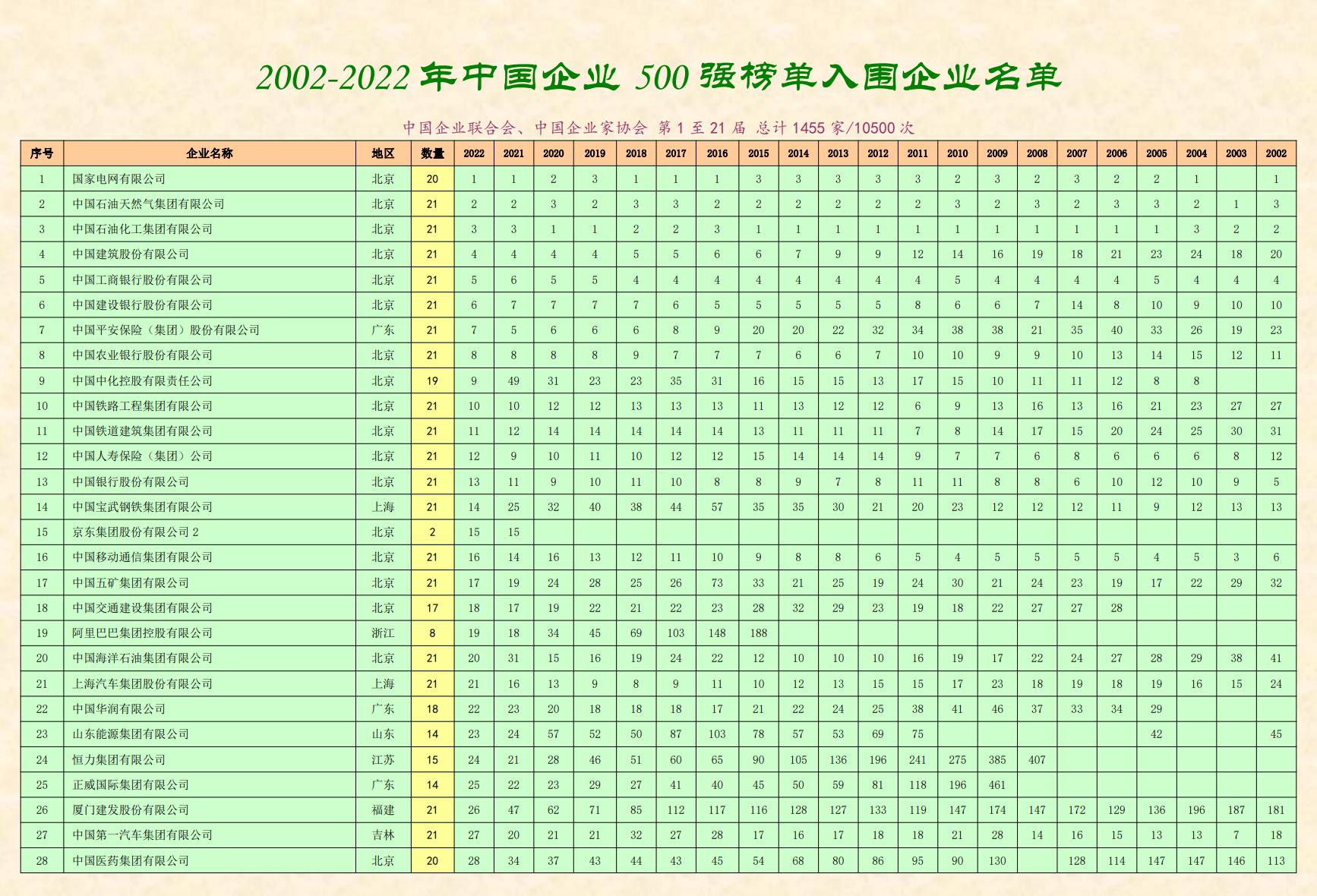 2002-202年中國企業(yè)500強(qiáng)榜單入圍企業(yè)名單