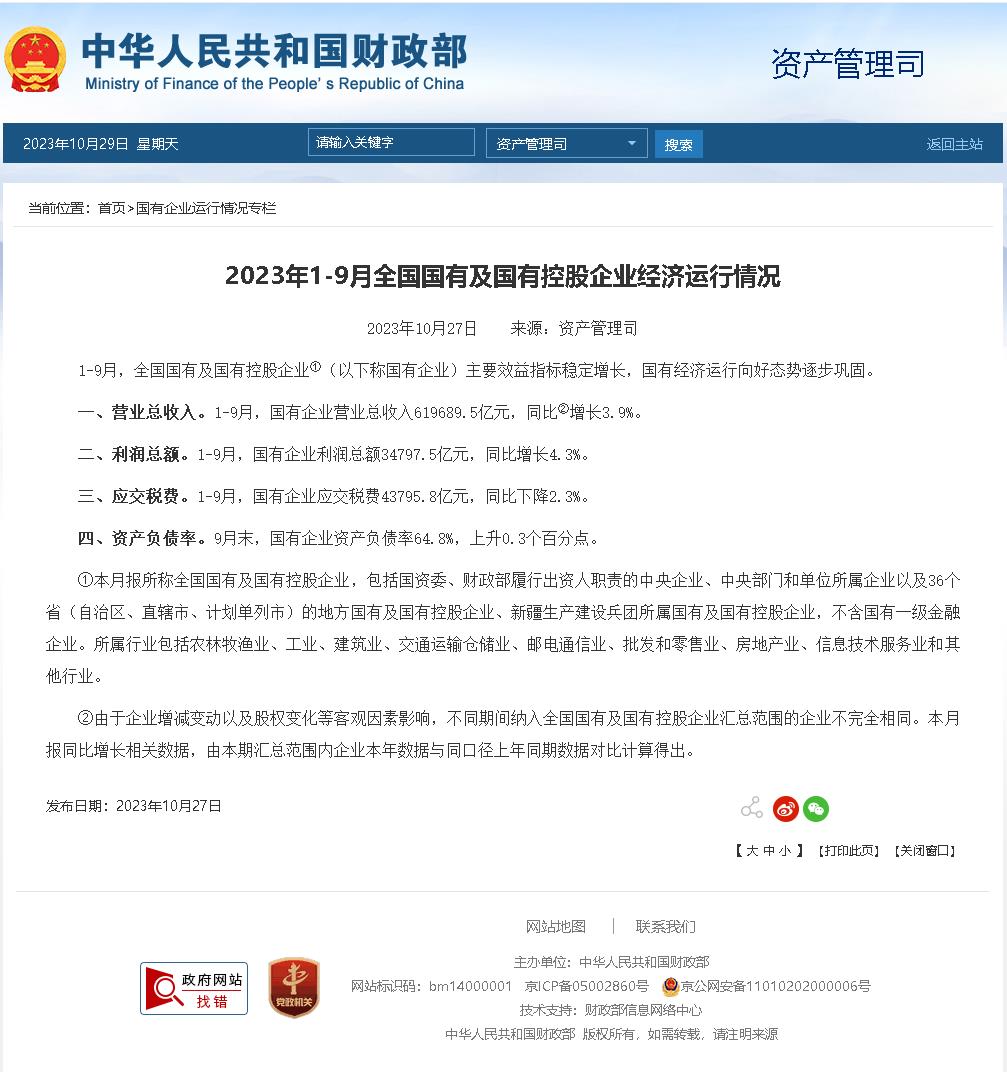 二、利潤總額。1-9月,國有企業(yè)利潤總額34797.5億元,同比增長4.3%。
