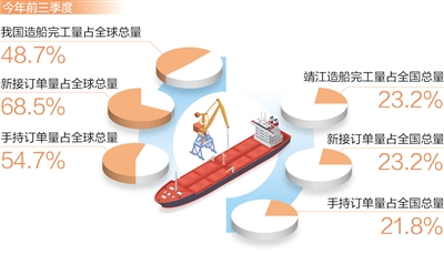 今年前三季度,我國造船完工量、新接訂單量和手持訂單量以載重噸計分別占全球總量的48.7%、68.5%和54.7%,均居世界第一。在江蘇泰州靖江市,當?shù)卦齑髽I(yè)的訂單排到了2026年,成為我國船舶業(yè)轉(zhuǎn)型升級、穩(wěn)步向好的縮影。