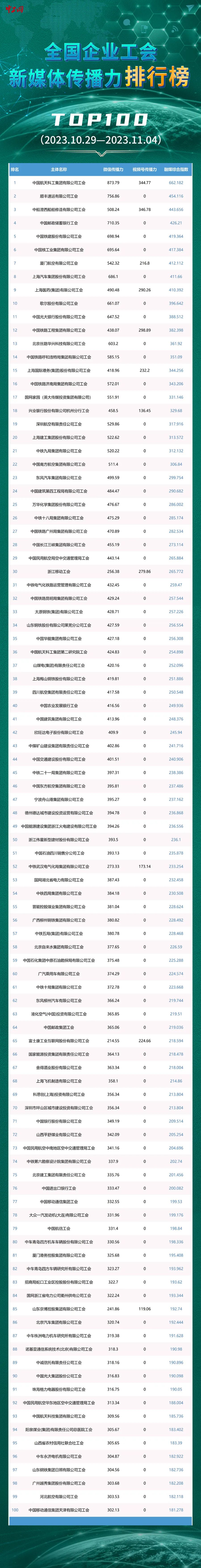 全國企業(yè)工會新媒體傳播力排行榜TOP100(2023.10.29—2023.11.4)