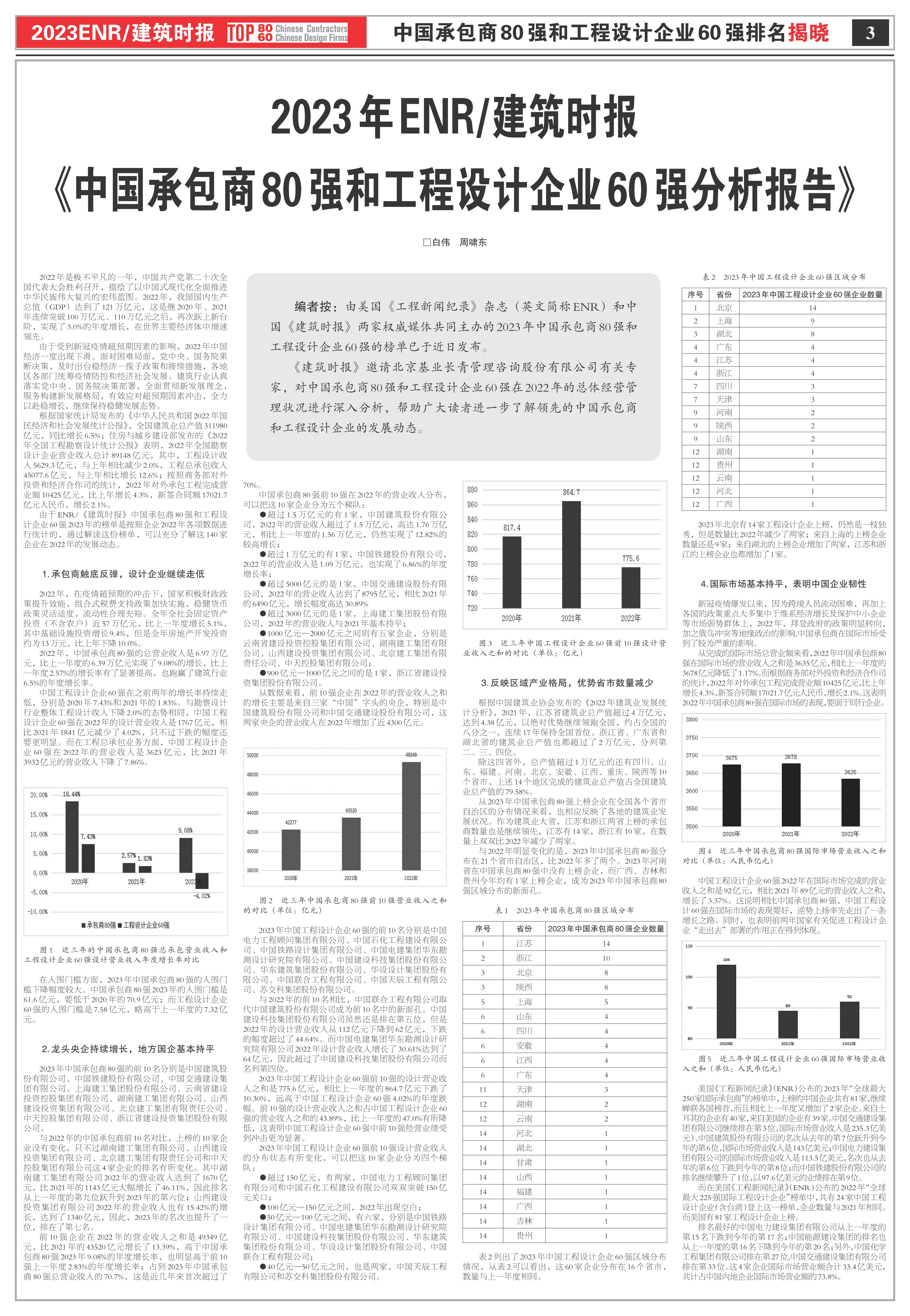 2023年度“中國承包商80強(qiáng)和工程設(shè)計(jì)企業(yè)60強(qiáng)”排名以2022年度企業(yè)工程承包和工程設(shè)計(jì)營業(yè)收入作為主要排名依據(jù)。中國建筑股份有限公司等80家承包商、中國電力工程顧問集團(tuán)有限公司等60家工程設(shè)計(jì)企業(yè)入圍新一年度榜單。