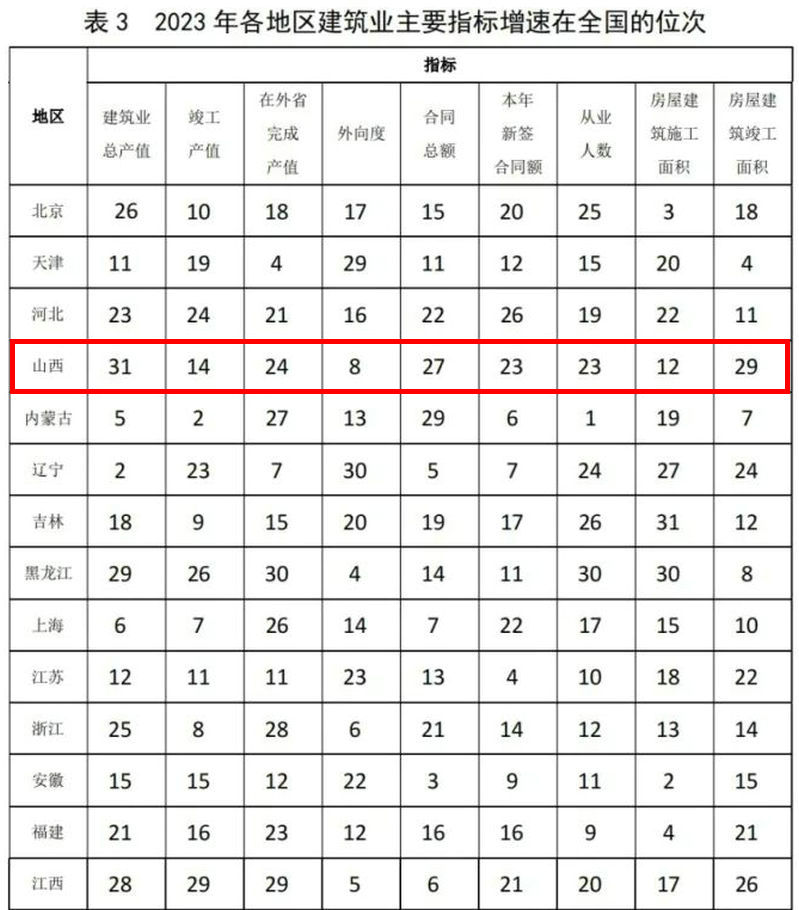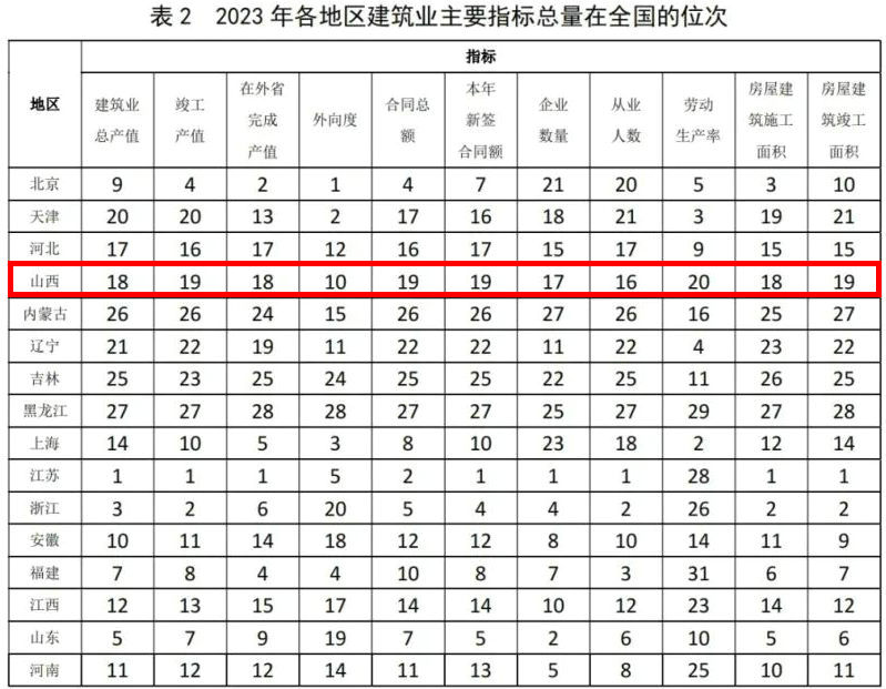 2023年,各地區(qū)建筑業(yè)主要指標(biāo)總量及增速在全國(guó)的位次分別如表2、表3所示。