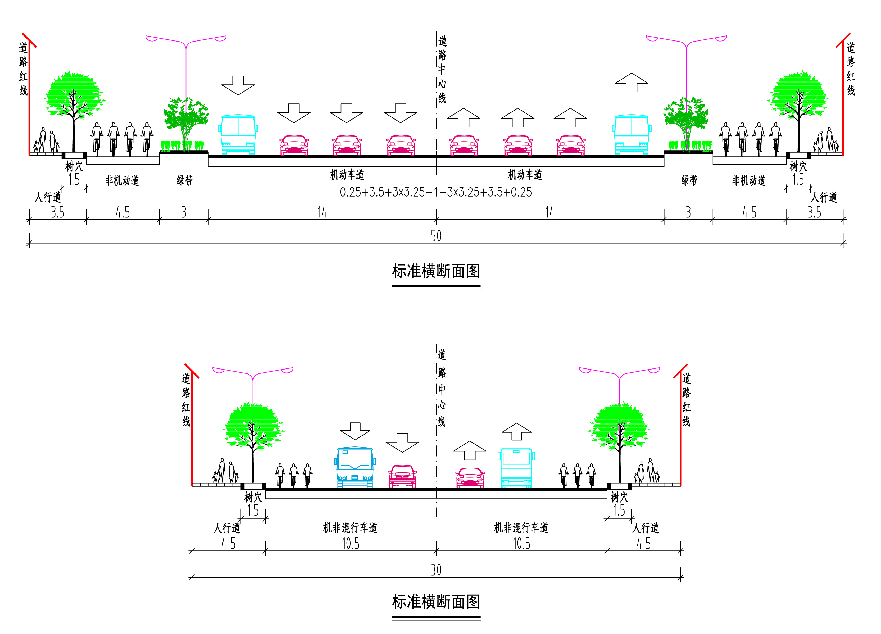 另外,50米推薦方案為中間28米寬機(jī)動(dòng)車道(雙向8車道),兩側(cè)各3米寬機(jī)非分隔帶,4.5米寬獨(dú)立非機(jī)動(dòng)車道,3.5米寬人行道(含一排行道樹)。30米推薦方案為中間21米寬機(jī)非混行車道(雙向4車道),4.5米寬人行道(含一排行道樹)。